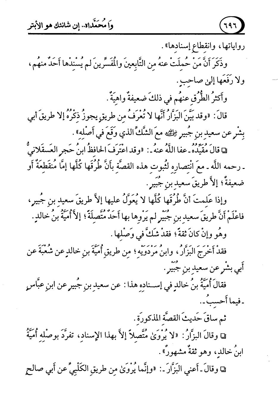 وإذا عَلِمتَ أنَّ طُرُقَها كلَّها لا يُعَوَّلُ عليها إلَّا طريقَ سعيدِ بنِ جُبيرٍ، فاعْلَمْ أَنَّ طريقَ سعيدِ بنِ جُبَيْرٍ لم يَرْوِها بها أَحَدٌ مُتَّصِلَةً؛ إلَّا أُميَّةُ بنُ خالدٍ.