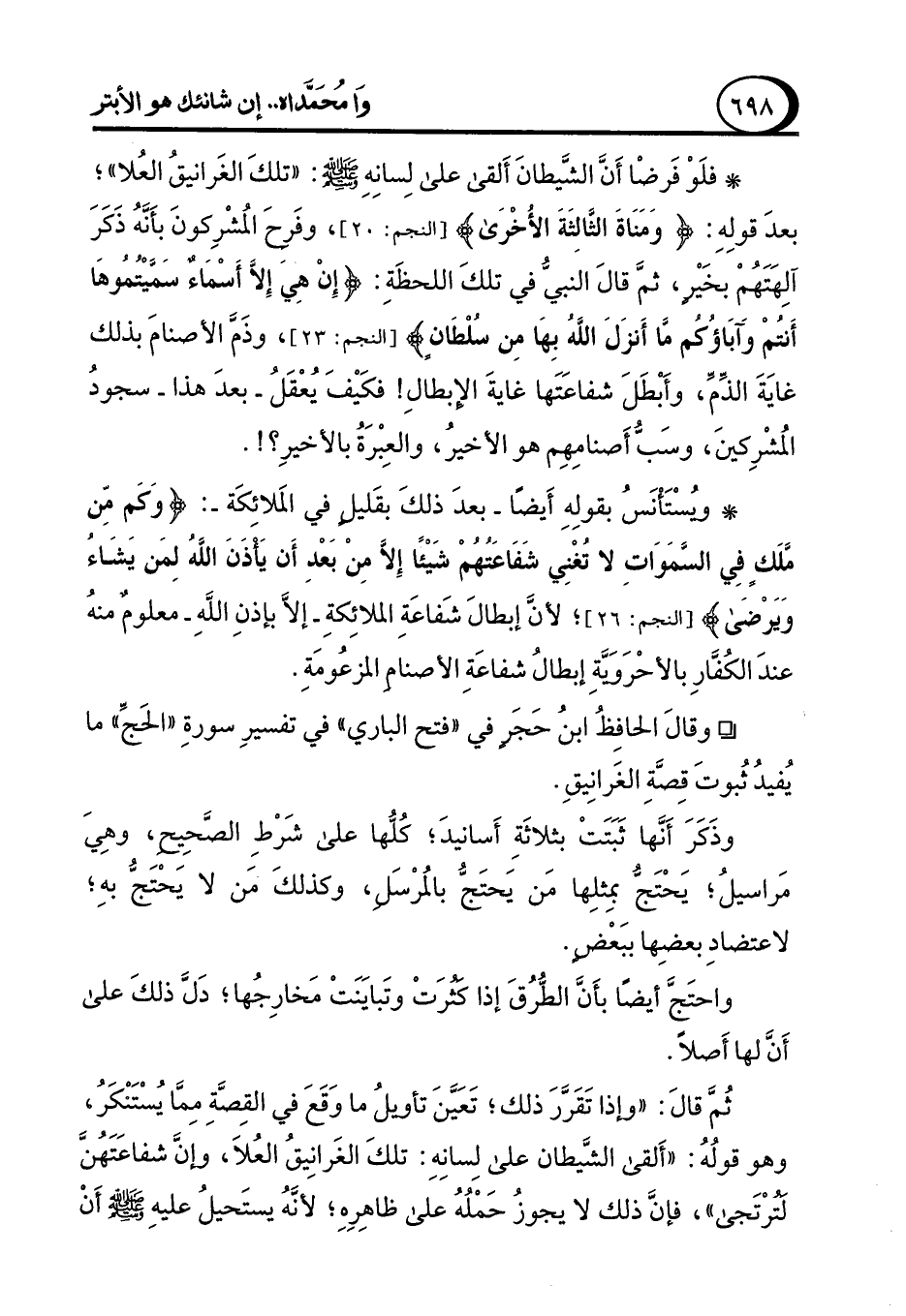 ° وقالَ الحافِظُ ابنُ حَجَرٍ في "فتح الباري" في تفسيرِ سورةِ "الحَجِّ" ما يُفيدُ ثُبوتَ قِصَّةِ الغَرانِيقِ.