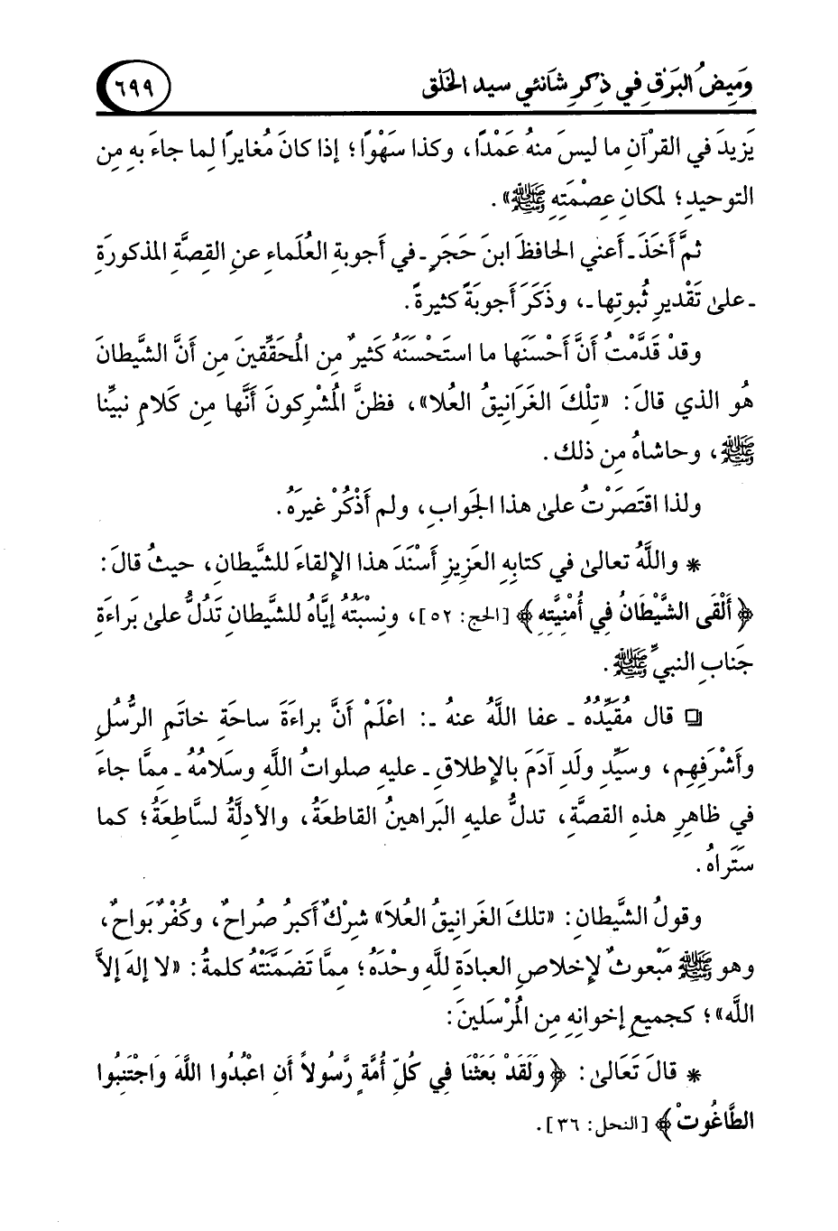 ° واللهُ تعالى في كتابِهِ العَزِيزِ أَسْنَدَ هذا الإلقاءَ للشَّيطانِ، حيثُ قالَ: {أَلْقَى الشَّيْطَانُ فِي أُمْنِيَّتِهِ} [الحج: 52]، ونِسْبَتُهُ إيَّاهُ للشَّيطانِ تَدُلُّ على بَراءَةِ جَنابِ النبيِّ - صلى الله عليه وسلم -.