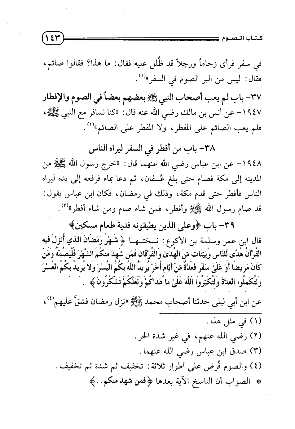 1947 - عن أنس بن مالك - رضي الله عنه - قال: «كنا نسافر مع النبي - صلى الله عليه وسلم -، فلم يعب الصائم عن المفطر، ولا المفطر على الصائم» (¬2).