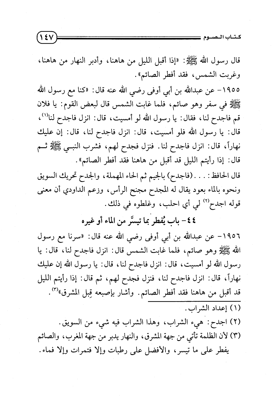 1956 - عن عبد الله بن أبي أوفى - رضي الله عنه - قال: سرنا مع رسول الله - صلى الله عليه وسلم - وهو صائم، فلما غابت الشمس قال: «انزل فاجدح لنا»، قال: يا رسول الله لو أمسيت، قال: «أنزل فاجدح لنا»، قال: يا رسول الله إن عليك نهارًا، قال: «انزل فاجدح لنا»، فنزل فجدح لهم، ثم قال: «إذا رأيتم الليل قد أقبل من ها هنا فقد أفطر الصائم. وأشار بإصبعه قبل المشرق» (¬3).