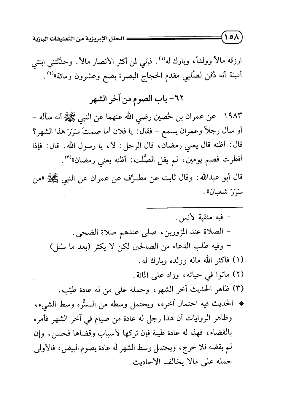 1983 - عن عمران بن حُصين - رضي الله عنهما - عن النبي - صلى الله عليه وسلم - أنه سأله - أو سأل رجلًا وعمران يسمع- فقال: «يا فلان أما صمتَ سَرَرَ هذا الشهر؟ » قال: أظنه قال نعم يعني رمضان، قال الرجل: لا، يا رسول الله. قال: «فإذا أفطرت فصم يومين»، لم يقل الصَّلت: أظنه يعني رمضان» (¬3).