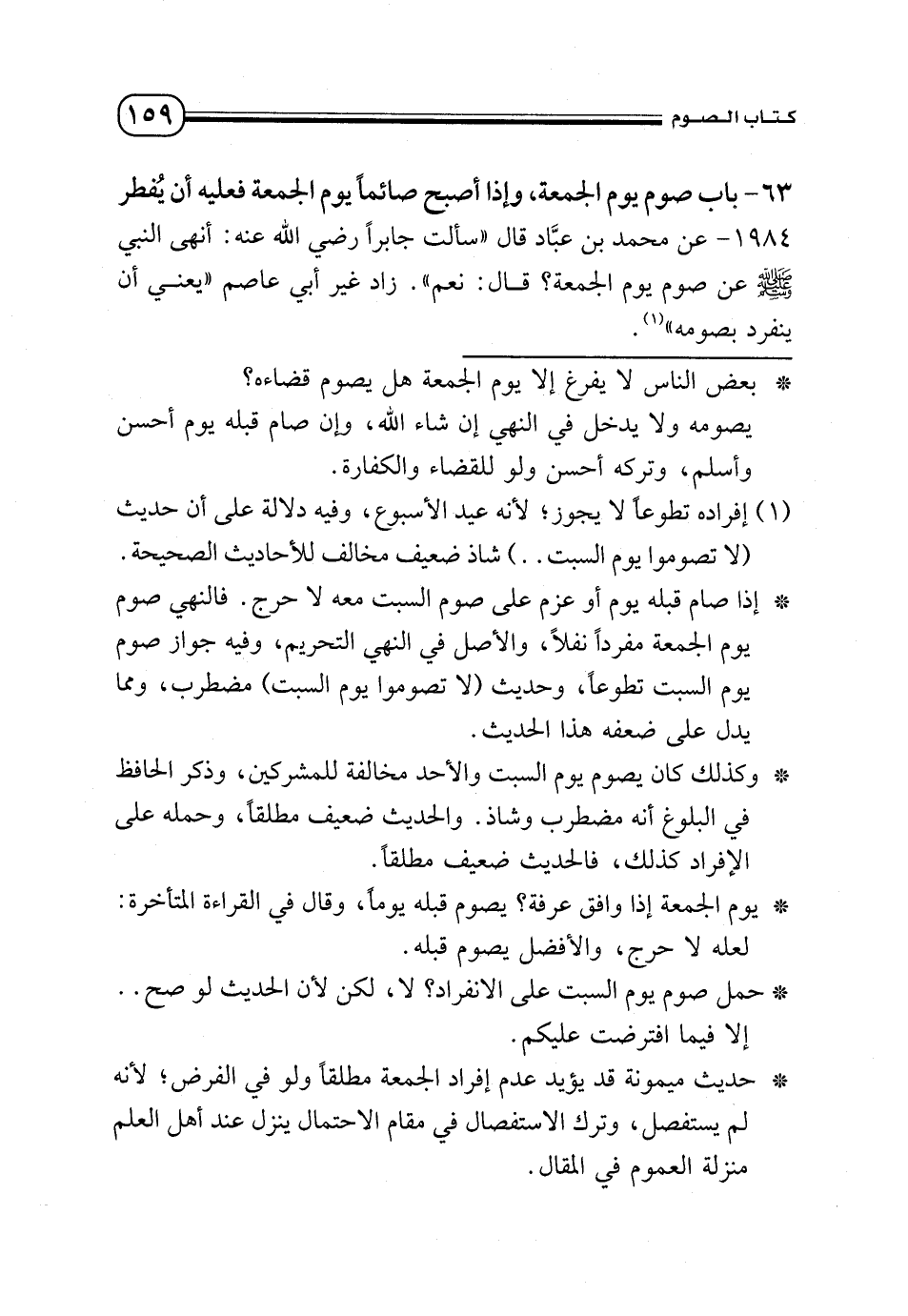 1984 - عن محمد بن عبَّاد قال «سألت جابرًا - رضي الله عنه -: أنهى النبي - صلى الله عليه وسلم - عن صوم يوم الجمعة؟ قال: نعم». زاد غير أبي عاصم «يعني أن ينفرد بصومه» (¬1).