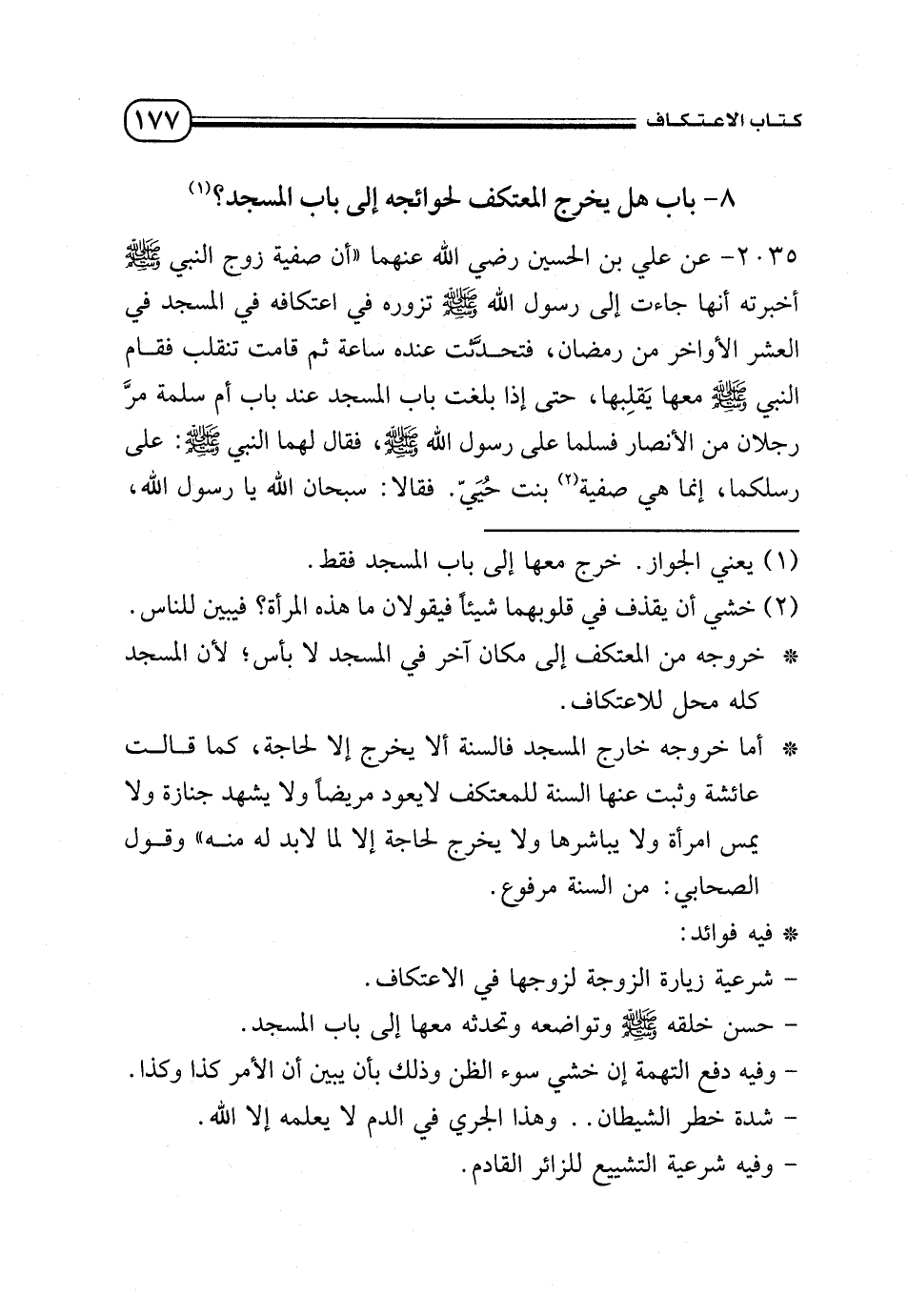 2035 - عن علي بن الحسين - رضي الله عنهما - «أن صفية زوج النبي - صلى الله عليه وسلم - أخبرته أنها جاءت إلى رسول الله - صلى الله عليه وسلم - تزوره في اعتكافه في المسجد في العشر الأواخر من رمضان، فتحدَّثت عنده ساعة ثم قامت تنقلب فقام النبي - صلى الله عليه وسلم - معها يَقلبها، حتى إذا بلغت باب المسجد عند باب أم سلمة مرَّ رجلان من الأنصار فسلما على رسول الله - صلى الله عليه وسلم -، فقالت لهما النبي - صلى الله عليه وسلم -: «على رسلكما، إنما هي صفية (¬2) بنت حُييّ». فقالا: سبحان الله يا رسول الله،