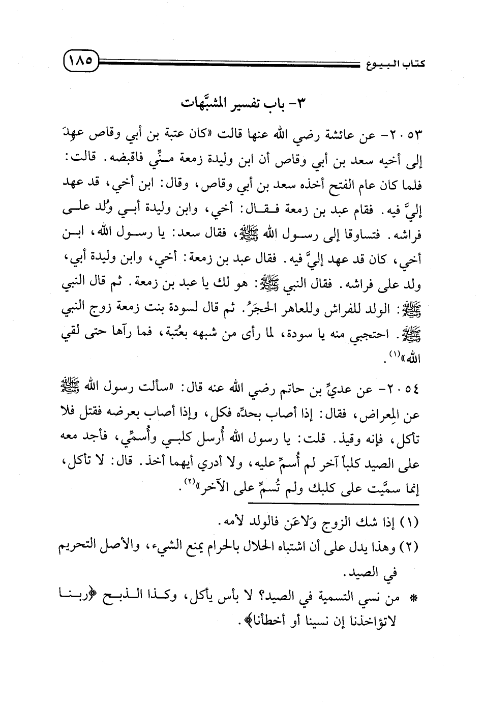 2054 - عن عديِّ بن حاتم - رضي الله عنه - قال: سألت رسول الله - صلى الله عليه وسلم - عن المِعراض، فقال: «إذا أصاب بحدِّه فكل، وإذا أصاب بعرضه فقتل فلا تأكل، فإنه وقيذ». قلت: يا رسول الله أُرسل كلبي وأُسمِّي، فأجد معه على الصيد كلبًا آخر لم أُسمِّ عليه، ولا أدري أيهما أخذ. قال: «لا تأكل، إنما سمَّيت على كلبك ولم تُسمِّ على الآخر» (¬2).