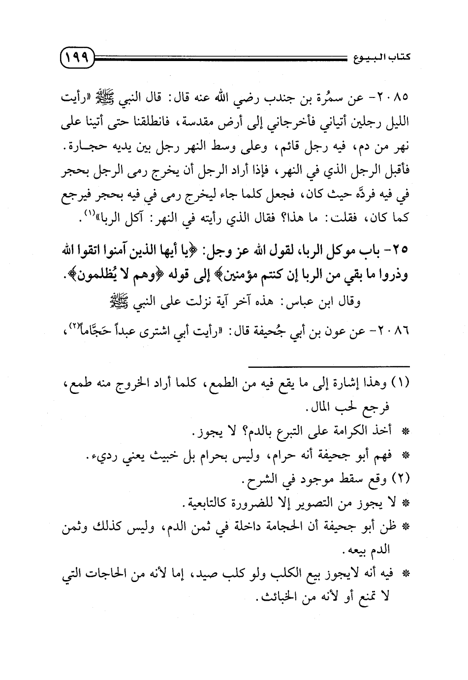 2085 - عن سمرة بن جندب - رضي الله عنه - قال: قال النبي - صلى الله عليه وسلم -: «رأيت الليلة رجلين أتياني فأخرجاني إلى أرض مقدسة، انطلقنا حتى أتينا على نهر من دم، فيه رجل قائم، وعلى وسط النهر رجل بين يديه حجارة، فأقبل الرجل الذي في النهر، فإذا أراد الرجل أن يخرج رمى الرجل بحجر في فيه فردّه حيث كان فجعل كلما جاء ليخرج رمى في فيه بحجر فيرجع كما كان، فقلت: ما هذا؟ فقال الذي رأيته في النهر: آكل الربا» (¬1).