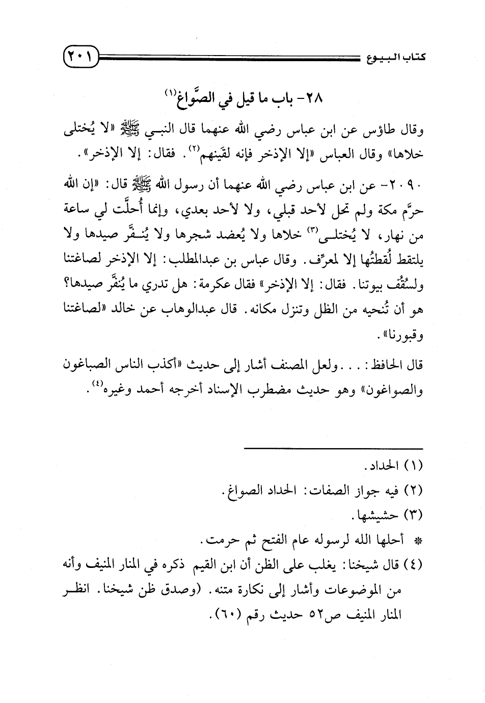 2090 - عن ابن عباس - رضي الله عنهما - أن رسول الله - صلى الله عليه وسلم - قال: «إن الله حرَّم مكة ولم تحل لأحد قبلي، ولا لأحد بعدي، وإنما أُحلت لي ساعة من نهار، لا يُختلى (¬3) خلاها، ولا يُعضد شجرها ولا يُنفر صيدها ولا يلتقط لقطتها إلا لمعرّف». وقال عباس بن عبد المطلب: إلا الإذخر لصاغتنا ولسُقف بيوتنا. فقال: «إلا الإذخر» فقال عكرمة: هل تدري ما يُنفر صيدها؟ هو أن تُنحية من الظل وتنزل مكانه. قال عبد الوهاب عن خالد «لصاغتنا وقبورنا».