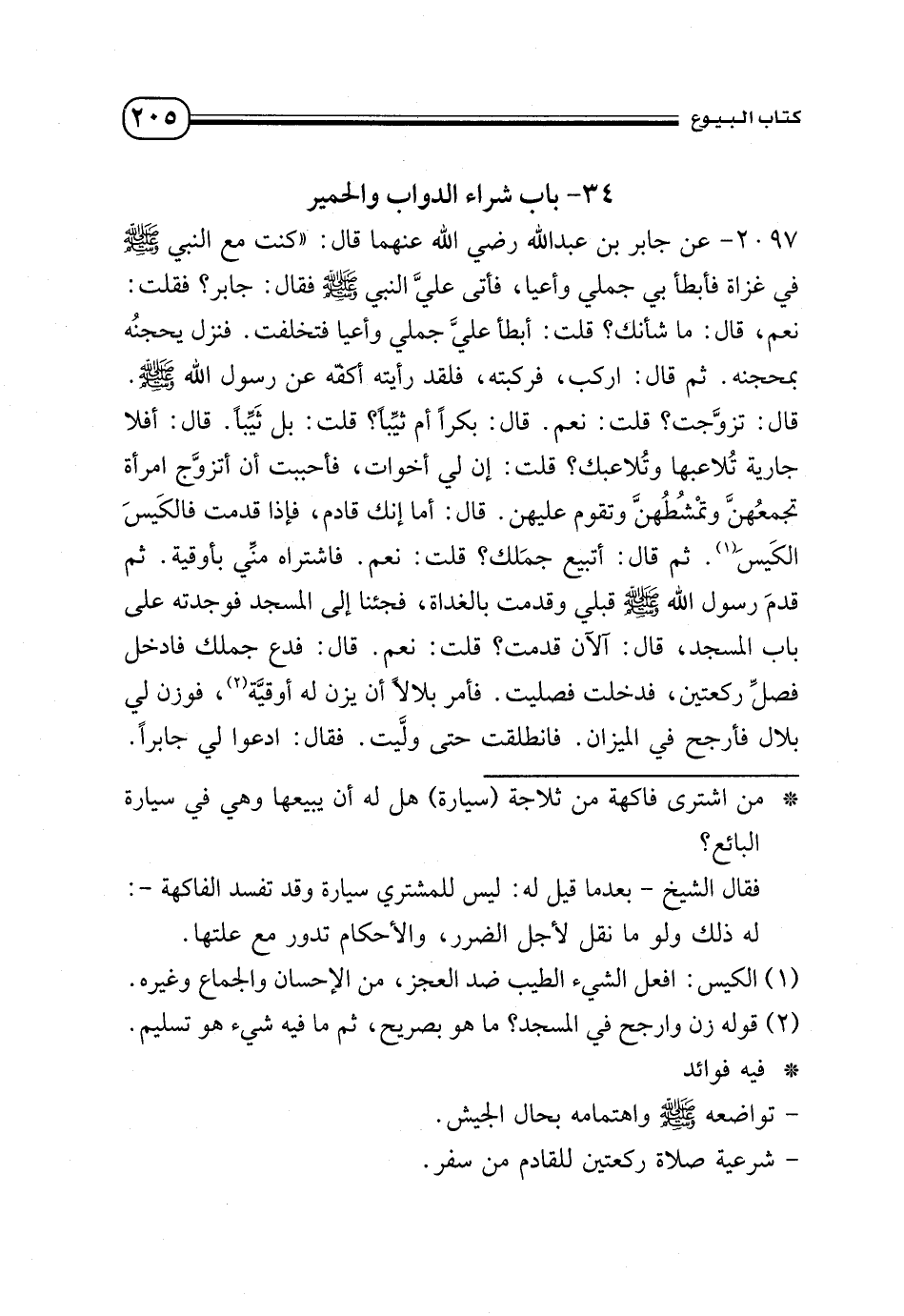 2079 - عن جابر بن عبد الله - رضي الله عنهما -، قال: كنت مع النبي - صلى الله عليه وسلم - في غزاة فأبطأ بي جملي وأعيا، فأتى عليَّ النبي - صلى الله عليه وسلم - فقال: «جار؟ » فقلت: نعم، قال: «ما شأنك؟ » قلت: أبطأ عليّ جملي وأعيا فتخلفت. فنزل يحجنُه بمحجنه ثم قال: «اركب»، فركبته، فقد رأيته أكفه عن رسول الله - صلى الله عليه وسلم -. قال: «تزوجت؟ » قلت: نعم قال: «بكرًا أم ثيبًا؟ » قلت: بل ثيبًا قال: «أفلا جارية تلاعبها وتُلاعبك؟ » قلت: إن لي أخوات، فأحببت أن أتزوج امرأة تجمعهم وتمشطهن وتقوم عليهن، قال: «إما إنك قادم، فإذا قدمت فالكيس الكيس» (¬1). ثم قال: «أتبيع جملك؟ » قلت نعم. فاشتراه مني بأوقية. ثم قدم رسول الله - صلى الله عليه وسلم - قبلي وقدمت بالغداة فجئنا إلى المسجد فوجدته على باب المسجد، قال: «الآن قدمت؟ » قلت: نعم. قال: «فدع جملك فادخل فصلَّ ركعتين»، فدخلت فصلت، . فأمر بلالًا أن يزن له أوقية (¬2)، فوزن لي بلال فأرجح في الميزان. فانطلقت حتى وليت. فقال: «ادعوا لي جابرًا»،