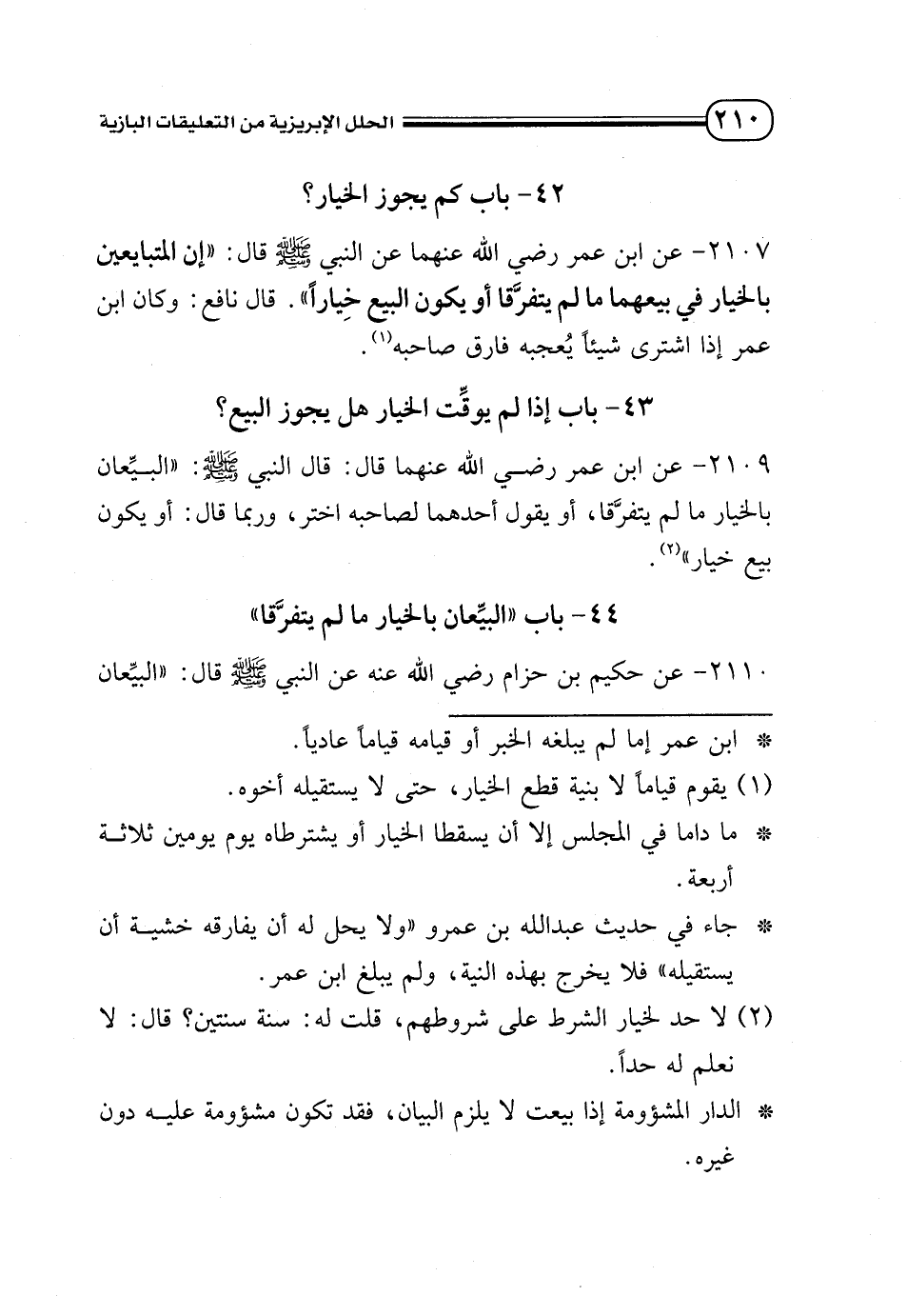 2109 - عن ابن عمر - رضي الله عنها - قال: قال النبي - صلى الله عليه وسلم -: «البيعان بالخيار ما لم يتفرَّقا، أو يقول أحدهما لصاحبه اختر، وربما قال: أو يكون بيع خيار» (¬2).