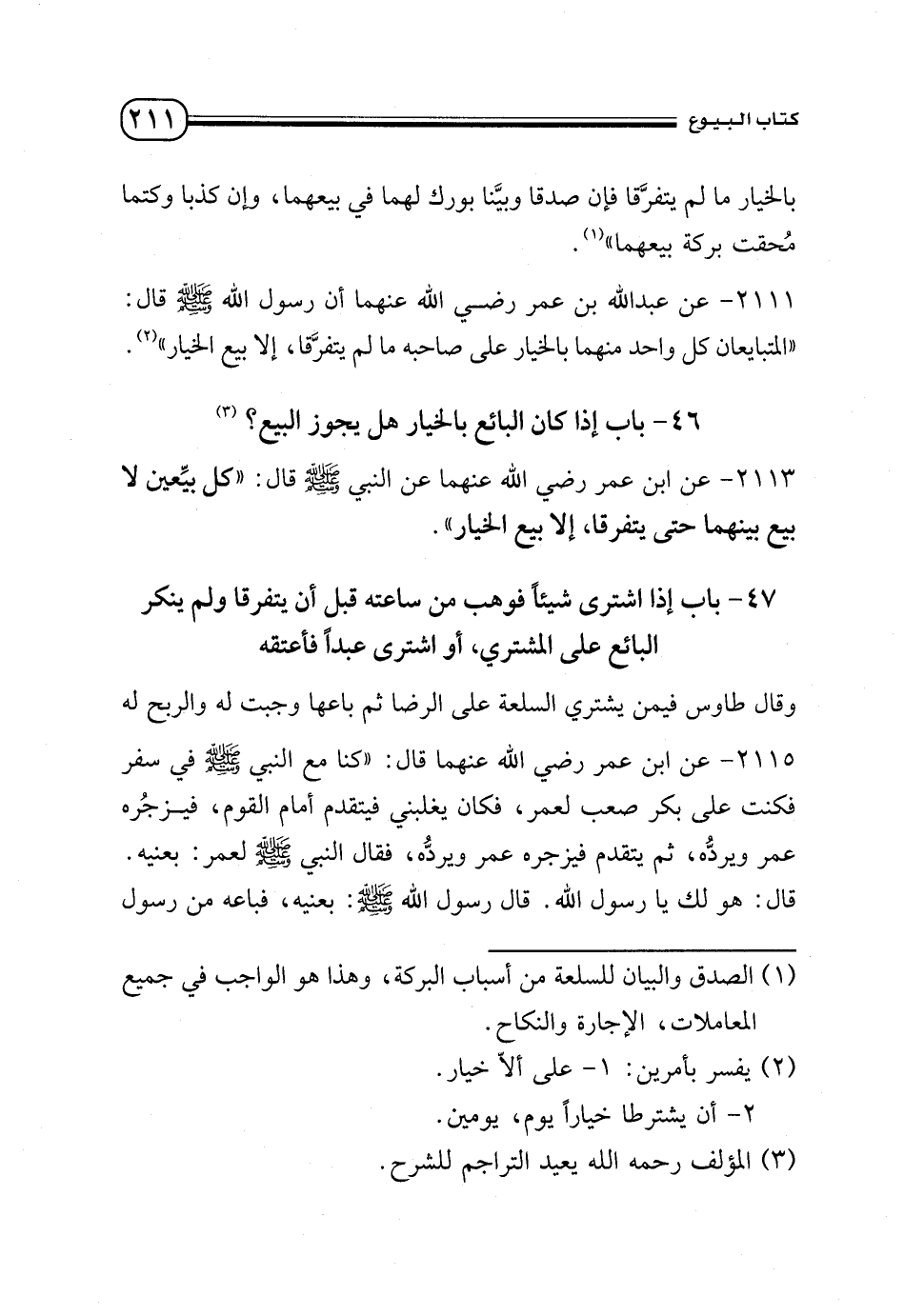 2111 - عن عبد الله بن عمر - رضي الله عنهما - أن رسول الله - صلى الله عليه وسلم - قال: «المتبايعان كل واحد منهما بالخيار على صاحبه ما لم يتفرَّقا، إلا بيع الخيار» (¬2).