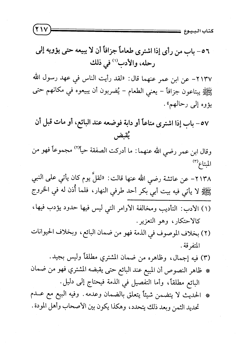 2137 - عن ابن عمر - رضي الله عنهما - قال: «لقد رأيت الناس في عهد رسول الله - صلى الله عليه وسلم - يبتاعون جزافًا - يعنى الطعام - يضربون أن يبيعوه في مكانهم حتى يؤوه إلى رحلهم».