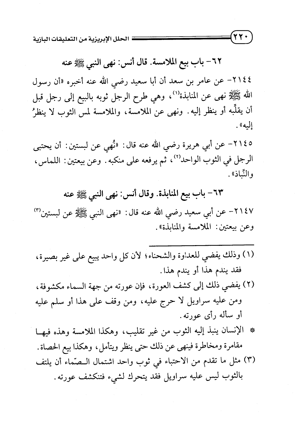 2147 - عن أبي سعيد - رضي الله عنه -: «نهي النبي - صلى الله عليه وسلم - عن لبستين (¬3) وعن بيعتين: الملامسة والمنابذة».