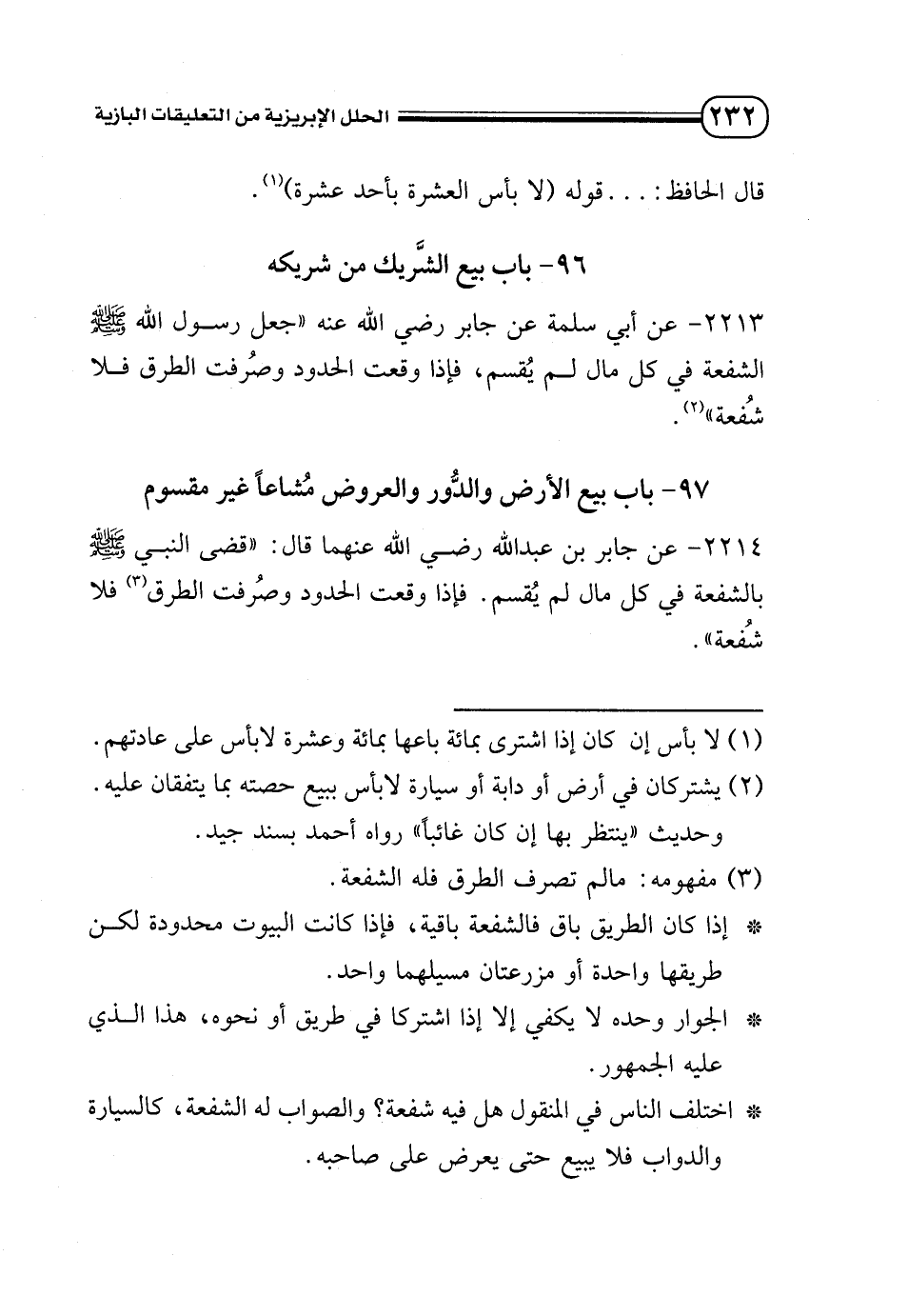2214 - عن جابر بن عبد الله - رضي الله عنهما - قال: «قضى النبي - صلى الله عليه وسلم - بالشفعة في كل مال لم يُقسم. فإذا وقعت الحدود وصُرفت الطرق (¬3) فعلا شُفعة».