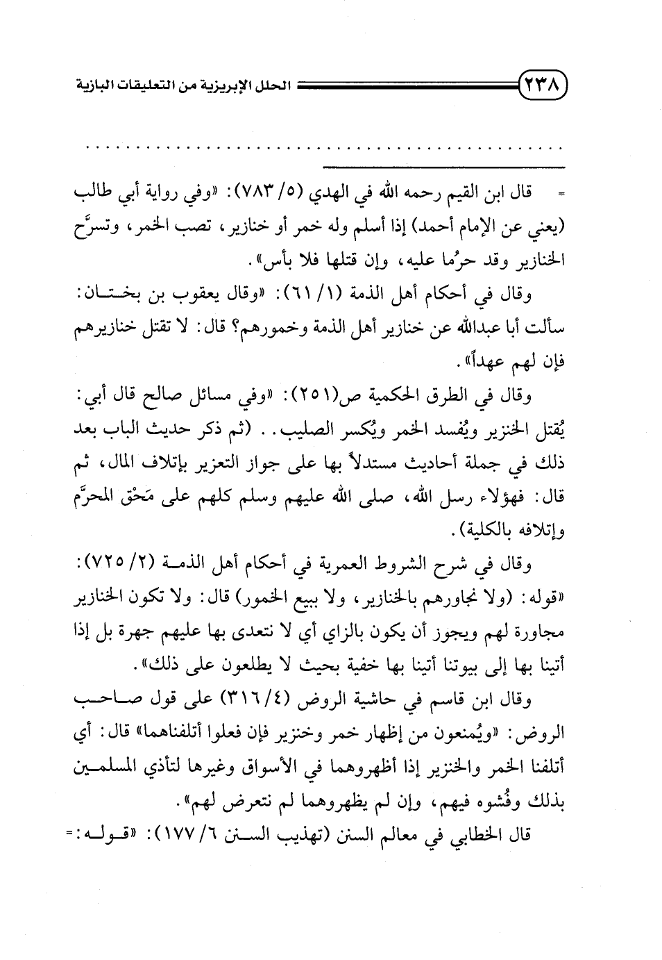 = قال ابن القيم / في الهدي (5/ 783): «وفي رواية أبي طالب (يعني عن الإمام أحمد) إذا أسلم وله خمر أو خنازير، تصب الخمر، وتسرَّح الخنازير وقد حرُما عليه، وإن قتلها فلا بأس».