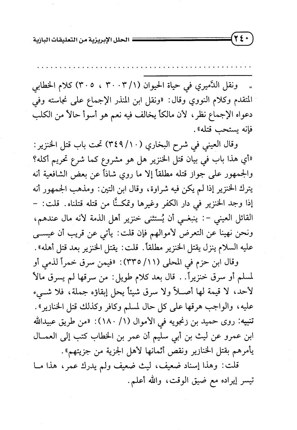 = ونقل الدميري في حياة الحيوان (1/ 3003، 305) كلام الخطابي المتقدم وكلام النووي وقال: «ونقل ابن المنذر الإجماع علي نجاسته وفي دعواه الإجماع نظر، لأن مالكًا يخالف فيه نعم هو أسوأ حالًا من الكلب فإنه يستحب قتله».