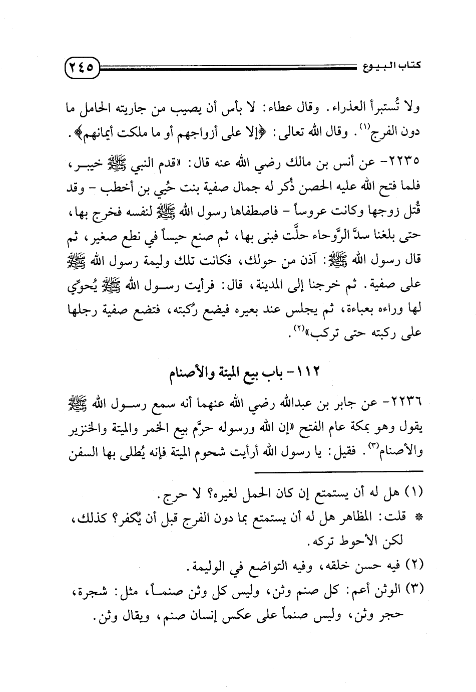 2235 - عن أنس بن مالك - رضي الله عنه - قال «قدم النبي - صلى الله عليه وسلم - خيبر، فلما فتح الله عليه الحصن ذكر له جمال صفية بنت حيي بن أخطب - وقد قتل زوجها وكانت عروسًا - فاصطفاها رسول الله - صلى الله عليه وسلم - لنفسه فخرج بها، حتى بلغنا سد الروحاء حلت فبنى بها، ثم صنع حيسًا في نطع صغير، ثم قال رسول الله - صلى الله عليه وسلم -: «آذن من حولك»، فكانت تلك وليمة رسول الله - صلى الله عليه وسلم - على صفية. ثم خرجنا إلى المدينة، قال: فرأيت رسول الله - صلى الله عليه وسلم - يحوي لها وراءه بعباءة، ثم يجلس عند بعيره فيضع ركبته، فتضع صفية رجلها على ركبته حتى تركب» (¬2).