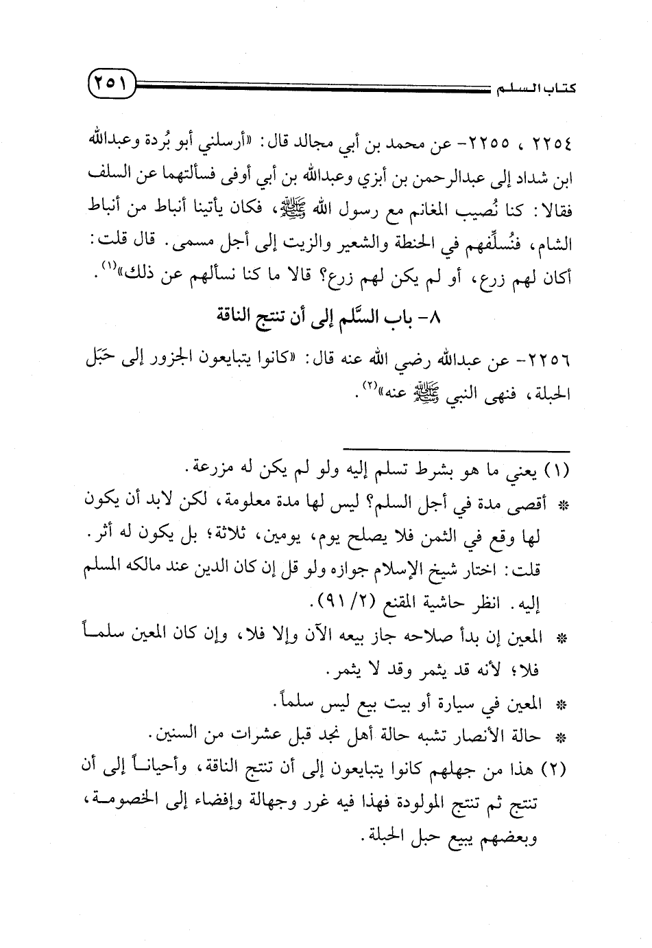 2254، 2255 - عن محمد بن أبي مجالد قال: «أرسلني أبو بُردة وعبد الله بن شداد إلى عبد الرحمن بن أبزى وعبد الله بن أبي أوفى فسألتهما عن السلف فقالا: كنا نُصيب المغانم مع رسول الله - صلى الله عليه وسلم -، فكان يأتينا أنباط من أنباط الشام، فنُسلِّفهم في الحنطة والشعير والزيت إلى أجل مسمى. قال قلت: أكان لهم زرع، أو لم يكن لهم زرع؟ قالا ما كنا نسألهم عن ذلك» (¬1).