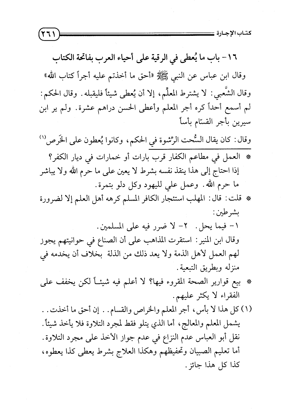 (¬1) كل هذا لا بأس، أجر المعلم والخراص والقسام .. إن أحق ما أخذت .. يشمل المعلم والمعالج، أما الذي يتلو فقط لمجرد التلاوة فلا يأخذ شيئًا. نقل أبو العباس عدم النزاع في عدم جواز الأخذ على مجرد التلاوة. أما تعليم الصبيان وتحفيظهم وهكذا العلاج بشرط يعطى كذا يعطوه، كذا كل هذا جائز.