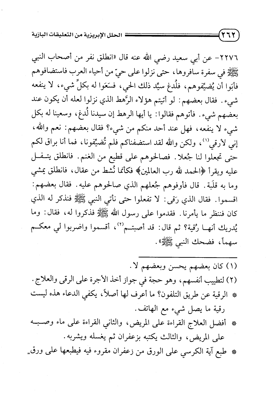 2276 - عن أبي سعيد - رضي الله عنه - قال: «انطلق نفر من أصحاب النبي - صلى الله عليه وسلم - في سفرة سافروها، حتى نزلوا على حيّ من أحياء العرب فاستضافوهم فأبّوا أن يُضيِّفوهم، فلُدغ سيِّد ذلك الحي، فسَعَوا له بكلِّ شيء، لا ينفعه شيء. فقال بعضهم: لو أتيتم هؤلاء الرَّهط الذي نزلوا لعله أن يكون عند بعضهم شيء. فأتوهم فقالوا: يا أيها الرهط إن سيدنا لُدغ، وسعينا له بكل شيء لا ينفعه، فهل عند أحد منكم من شيء؟ فقال بعضهم: نعم والله، إني لأرقى (¬1)، ولكن والله لقد استضفناكم فلم تُضيَّفونا، فما أنا براق لكم حتى تجعلوا لنا جُعلا. فصالحوهم على قطيع من الغنم. فانطلق يتفل عليه ويقرأ: {الْحَمْدُ لِلَّهِ رَبِّ الْعَالَمِينَ} فكأنما نُشط من عقال، فانطلق يمشي وما به قَلبة. قال فأوفوهم جُعلهم الذي صالحوهم عليه. فقال بعضهم: اقسموا. فقال الذي رَقى: لا تفعلوا حتى نأتي النبي - صلى الله عليه وسلم - فنذكر له الذي كان فننظر ما يأمرنا. فقدموا على رسول الله - صلى الله عليه وسلم - فذكروا له، فقال: «وما يُدريك أنها رُقية؟ » ثم قال: «قد أصبتم» (¬2)،