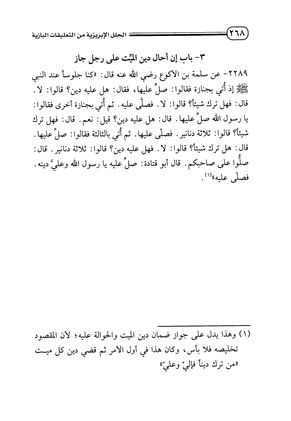 2289 - عن سلمة بن الأكوع - رضي الله عنه - قال: «كنا جلوسًا عند النبي - صلى الله عليه وسلم - إذ أتي بجنازة فقالوا: صل عليها، فقال: «هل عليه دين؟ » قالوا: لا. قال: «فهل ترك شيئًا؟ » قالوا: لا، فصلى عليه. ثم أتي بجنازة أخرى فقالوا: يا رسول الله صل عليها. قال: «هل عليه دين؟ » قيل نعم. قال: «فهل ترك شيئًا؟ » قالوا: ثلاثة دنانير. فصلى عليها. ثم أتي بالثالثة فقالوا: صل عليها. قال: هل ترك شيئًا؟ » قالوا لا. «فهل عليه دين؟ » قالوا: ثلاثة دنانير. قال: صلوا على صاحبكم. قال أبو قتادة: صل عليه يا رسول الله وعلى دينه. فصلى عليه» (¬1).