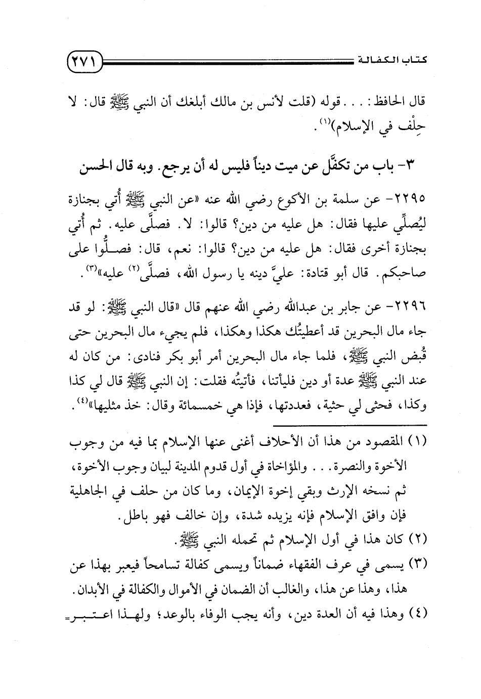 2295 - عن سلمة بن الأكواع - رضي الله عنه - «عن النبي - صلى الله عليه وسلم - أتي بجنازة ليصلي عليه فقال: «هل عليه من دين؟ » قالوا: لا فصلى عليه. ثم أتي بجنازة أخرى فقال: «هل عليه من دين؟ » قالوا: نعم، قال: فصلوا على صاحبكم. قال أبو قتادة: علي دينه يا رسول الله، فصلى (¬2) عليه» (¬3).