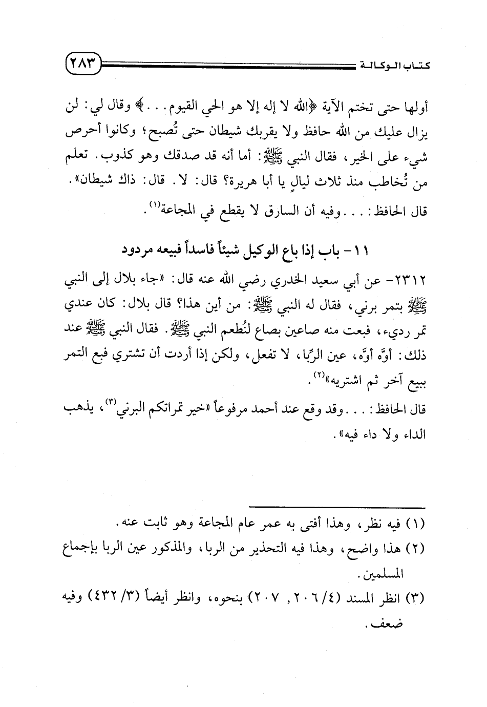 2312 - عن أبي سعيد الخدري - رضي الله عنه - قال: جاء بلال إلى النبي - صلى الله عليه وسلم - بتمر برني، فقال له النبي - صلى الله عليه وسلم -: «من أين هذا؟ » قال بلال: كان عندي تمر رديء، فبعت منه صاعين بصاع لنُطعم النبي - صلى الله عليه وسلم -. فقال النبي - صلى الله عليه وسلم - عند ذلك: «أوَّه أوَّه، عين الرِّبا، لا تفعل، ولكن إذا أردت أن تشتري فبع التمر ببيع آخر ثم اشتريه» (¬2).