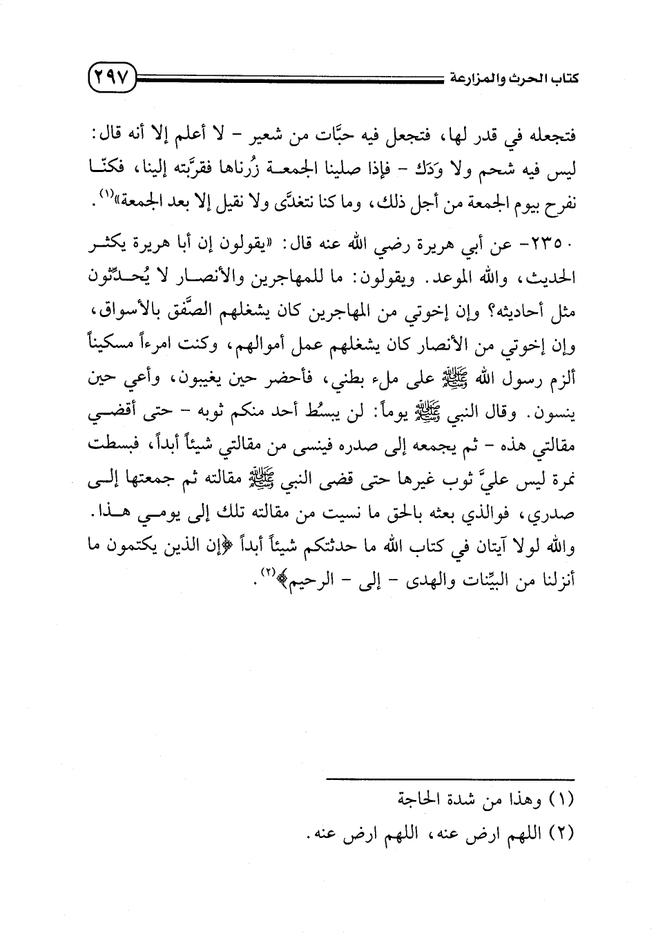 2350 - عن أبي هريرة - رضي الله عنه - قال: «يقولون إنا أبا هريرة يكثر الحديث، والله الموعد. ويقولون: ما للمهاجرين والأنصار لا يُحدِّثون مثل أحاديثه؟ وإن إخوتي من المهاجرين كان يشغلهم الصَّفق بالأسواق، وإن إخوتي من الأنصار كان يشغلهم عمل أموالهم، وكنت امرءً مسكينًا ألزم رسول الله - صلى الله عليه وسلم - على ملء بطني، فأحضر حين يغيبون، وأعي حين ينسون. وقال النبي - صلى الله عليه وسلم - يومًا: «لن يبسُط أحد منكم ثوبه - حتى أقضي مقالتي هذه - ثم يجمعه إلى صدره فينسى من مقالتي شيئًا أبدًا»، فبسطت نمرة ليس عليَّ ثوب غيرها حتى قضى النبي - صلى الله عليه وسلم - مقالته ثم جمعتها إلى صدري، فوالذي بعثه بالحق ما نسيت من مقالته تلك إلى يومي هذا.