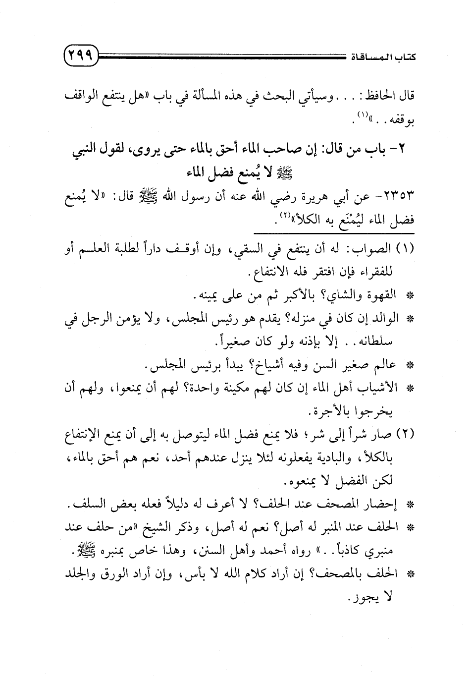 2353 - عن أبي هريرة - رضي الله عنه - أن رسول الله - صلى الله عليه وسلم - قال: «لا يُمنع فضل الماء ليُمْنَع به الكلأ» (¬2).