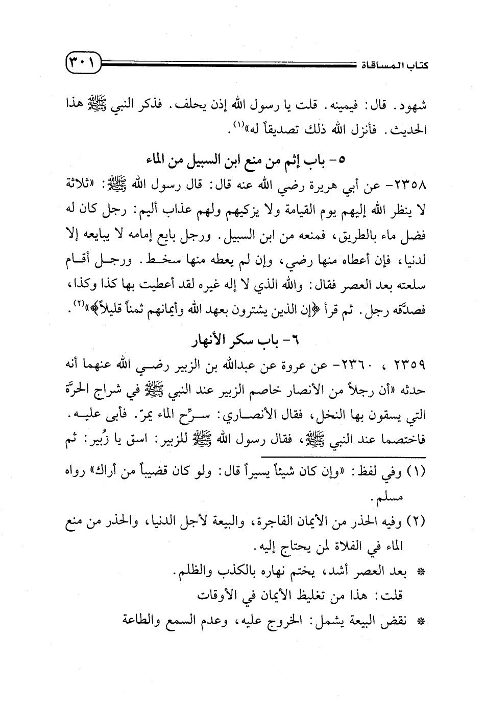 2358 - عن أبي هريرة - رضي الله عنه - قال: قال رسول الله - صلى الله عليه وسلم -: «ثلاثة لا ينظر الله إليهم يوم القيامة ولا يزكيهم ولهم عذاب أليم: رجل كان له فضل ماء بالطريق، فمنعه من ابن السبيل. ورجل بايع إمامه لا يبايعه إلا لدنيا، فإن أعطاه منها رضي، وإن لم يعطه منها سخط. ورجل أقام سلعته بعد العصر فقال: والله الذي لا إله غيره لقت أعطيت بها كذا وكذا، فصدًّقه رجل. ثم قرأ {إِنَّ الَّذِينَ يَشْتَرُونَ بِعَهْدِ اللَّهِ وَأَيْمَانِهِمْ ثَمَنًا قَلِيلًا}» (¬2).