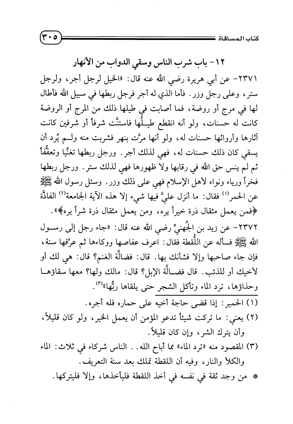 2371 - عن أبي هريرة - رضي الله عنه - قال: «الخيل لرجل أجر، ولرجل ستر، وعلى رجل وزر. فأما الذي له أجر فرجل ربطها في سبيل الله فأطال لها في مرج أو روضة، فما أصابت في طيلها ذلك من المرج أو الروضة كانت له حسنات، ولو انه انقطع طيلُها فاستنت شرفًا أو شرفين كانت أثارها وأرواثها حسنات له، ولو أنها مرت بنهر فشربت منه ولم يُرد أن يسقى كان ذلك حسنات له، فهي لذلك أجر. ورجل ربطها تغنيًا وتعفُفًا ثم لم ينس حق الله في رقابها ولا ظهورها فهي لذلك ستر. ورجل ربطها فخرًا ورياء ونواء لأهل الإسلام فهي على ذلك وزر. وسئل رسول الله - صلى الله عليه وسلم - عن الحمر (¬1) فقال: «ما انزل علىٌ فيها شيء إلا هذه الآية الجامعة (¬2) الفاذة {فَمَنْ يَعْمَلْ مِثْقَالَ ذَرَّةٍ خَيْرًا يَرَهُ (7) وَمَنْ يَعْمَلْ مِثْقَالَ ذَرَّةٍ شَرًّا يَرَهُ}».