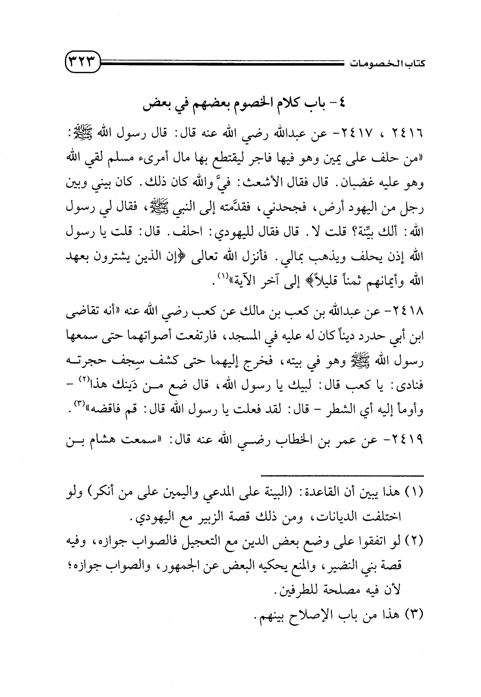 2416 - 2417 - عن عبد الله - رضي الله عنه - قال: قال رسول الله - صلى الله عليه وسلم -: «من حلف على يمين وهو فيها فاجر ليقتطع بها مال أمرئ مسلم لقي الله وهو عليه غضبا». قال فقال الأشعث: فيَ والله كان ذلك. كان بيني وبين رجل من اليهود أرض، فجحدني، فقدمته إلى النبي - صلى الله عليه وسلم -، فقال لي رسول الله: «ألك بينة؟ » قلت لا. قال فقال لليهودي: أحلف. قال: قلت يا رسول الله إذن يحلف ويذهب بمالي. فأنزل الله تعالى {إِنَّ الَّذِينَ يَشْتَرُونَ بِعَهْدِ اللَّهِ وَأَيْمَانِهِمْ ثَمَنًا قَلِيلًا} إلى آخر الآية» (¬1).
