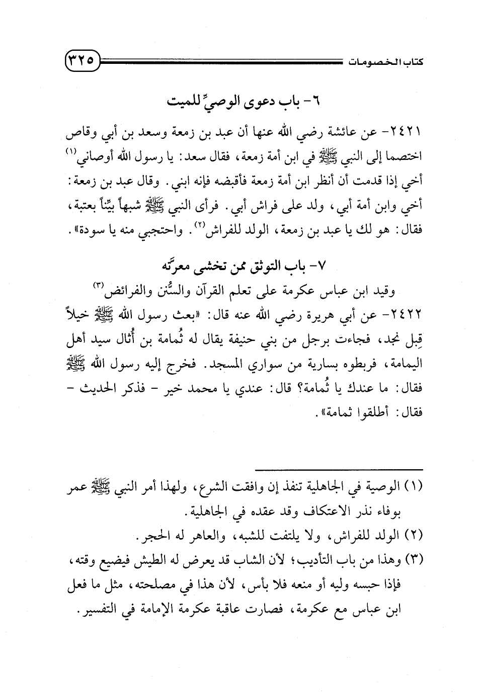 2421 - عن عائشة - رضي الله عنها - أن عبد بن زمعة وسعد بن أبي وقاص اختصما إلى النبي - صلى الله عليه وسلم - في ابن أمة زمعة، فقال سعد: يا رسول الله أوصاني (¬1) أخي إذا قدمت أن أنظر ابن أمة زمعة فأقبضه فإنه ابني. وقال عبد بن زمعة: أخي وابن أمة أبي، ولد على فراش أبي. فرأى النبي - صلى الله عليه وسلم - شبهًا بيِّنًا بعتبة، فقال: هو لك يا عبد بن زمعة، الولد للفراش (¬2). واحتجبي منه يا سودة».