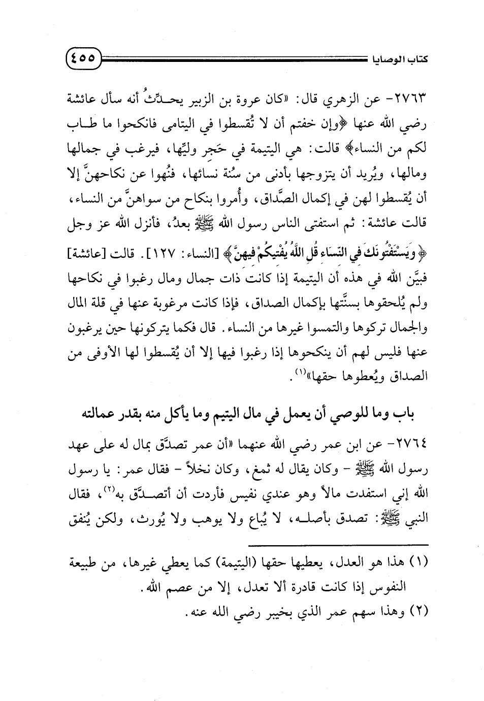 2763 - عن الزهري قال: «كان عروة بن الزبير يحدَّثُ أنه سأل عائشة - رضي الله عنها - {وَإِنْ خِفْتُمْ أَلَّا تُقْسِطُوا فِي الْيَتَامَى فَانْكِحُوا مَا طَابَ لَكُمْ مِنَ النِّسَاءِ} قالت: هي اليتيمة في حَجِر وليَّها، فيرغب في جمالها ومالها، ويُريد أن يتزوجها بأدنى من سُنة نسائها، فُنهوا عن نكاحهنَّ إلا أن يُقسطوا لهن في إكمال الصَّداق، وأُمروا بنكاح من سواهنَّ من النساء، قالت عائشة: ثم استفتى الناس رسول الله - صلى الله عليه وسلم - بعدُ، فأنزل الله - عز وجل - {وَيَسْتَفْتُونَكَ فِي النِّسَاءِ قُلِ اللَّهُ يُفْتِيكُمْ فِيهِنَّ} [النساء: 127].