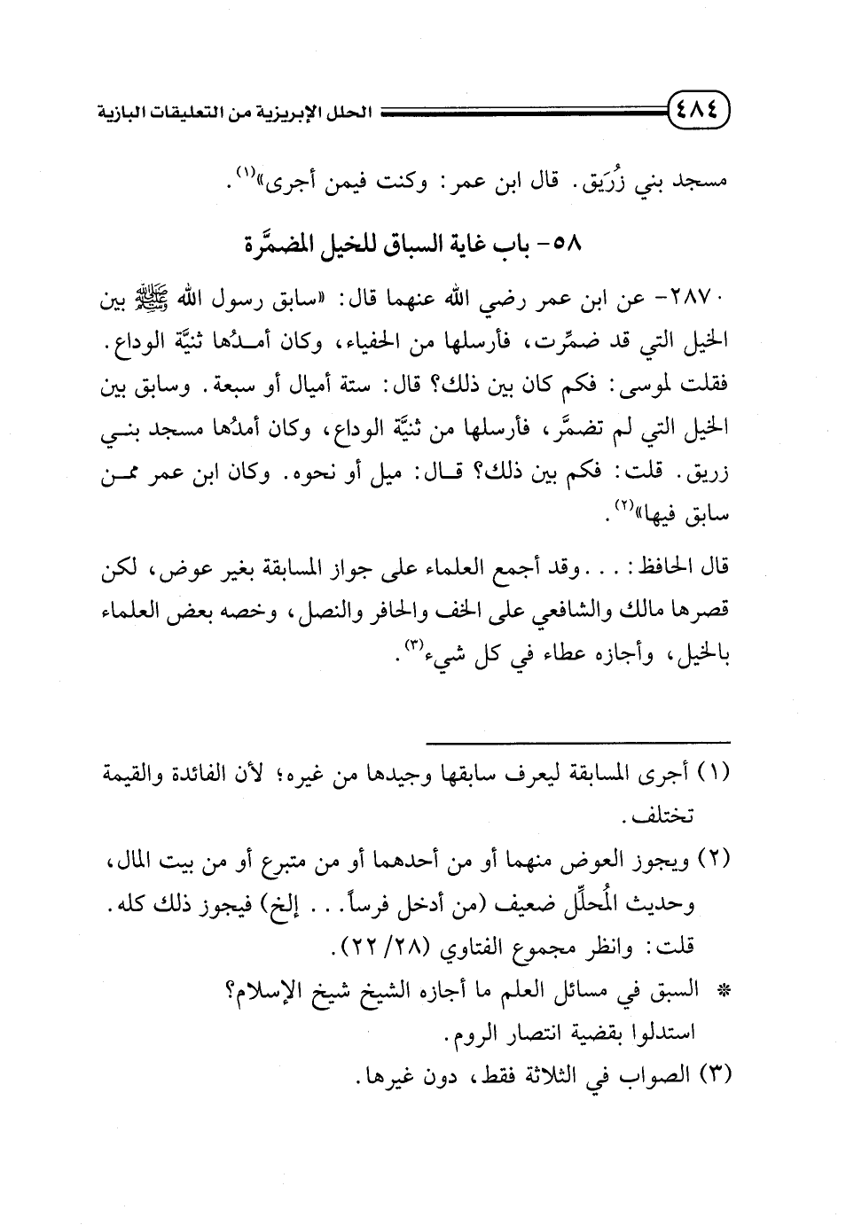 2870 - عن ابن عمر - رضي الله عنهما - قال: «سابق رسول الله - صلى الله عليه وسلم - بين الخيل التي قد ضُمرت، فأرسلها من الحفياء، وكان أمدُها ثنيَّة الوداع. فقلت لموسى: فكم كان بين ذلك؟ قال: ستة أميال أو سبعة. وسابق بين الخيل التي لم تضمَّر، فأرسلها من ثنيَّة الوداع، وكان أمدُها مسجد بني زريق. قلت: فكم بين ذلك؟ قال: ميل أو نحوه. وكان ابن عمر ممن سابق فيها» (¬2).