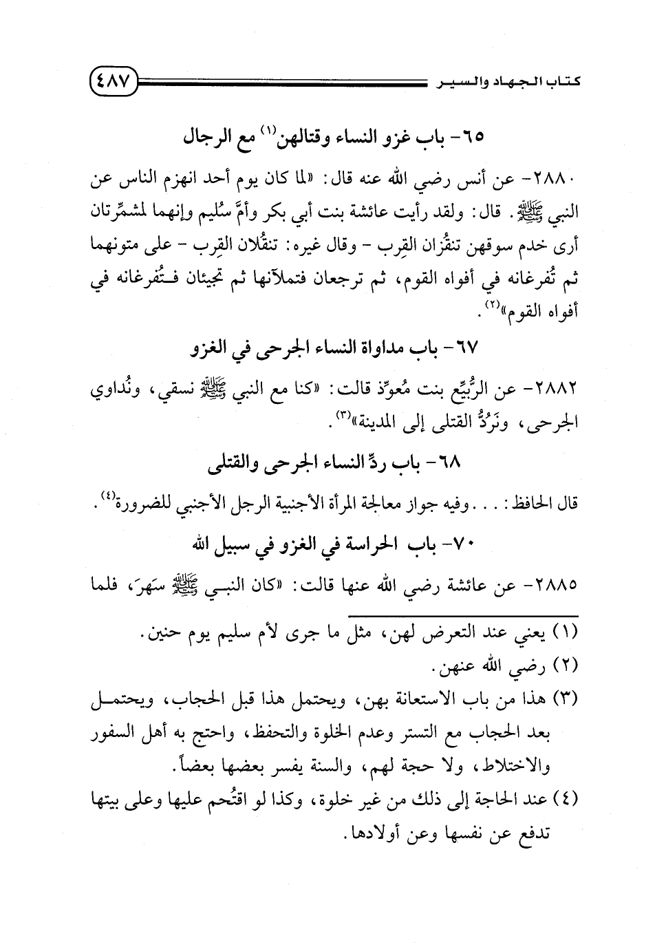 2880 - عن أنس - رضي الله عنه - قال: «لما كان يوم أحد انهزم الناس عن النبي - صلى الله عليه وسلم - قال: ولقد رأيت عائشة بنت أبي بكر وأمَّ سُليم وإنهما لمشمَّرتان أرى خدم سوقهن تنقُزان القربِ- وقال غيرة: تنقُلان القِرب- على متونهما ثم تُفرغانه في أفواه القوم، ثم ترجعان فتملآنها ثم تجيئان فتُفرغانه في أفواه القوم» (¬2).