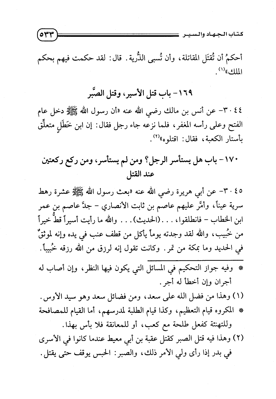 (¬2) وهذا فيه قتل الصبر كقتل عقبة بن أبى معيط عندما كانوا في الأسري في بدر إذا رأى ولى الأمر ذلك, والصبر: الحبس يوقف حتى يقتل.
