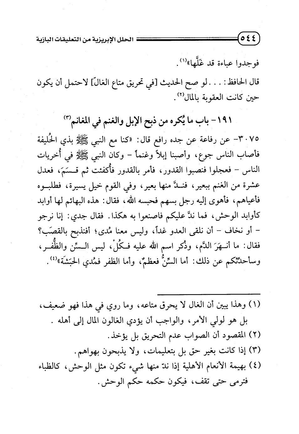 191 - باب ما يُكره من ذبح الإبل والغنم في المغانم (¬3)