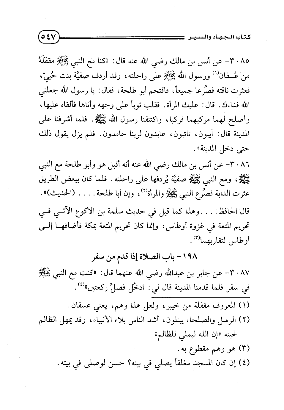 3086 - عن أنس بن مالك - رضي الله عنه - أنه أقبل هو وأبو طلحة مع النبي - صلى الله عليه وسلم -، ومع النبي - صلى الله عليه وسلم - صفيَّة يُردفها على راحلته. فلما كان ببعض الطريق عثرت الدابة فصرُع النبي - صلى الله عليه وسلم - والمرأة (¬2)، وإن أبا طلحة ... (الحديث)».