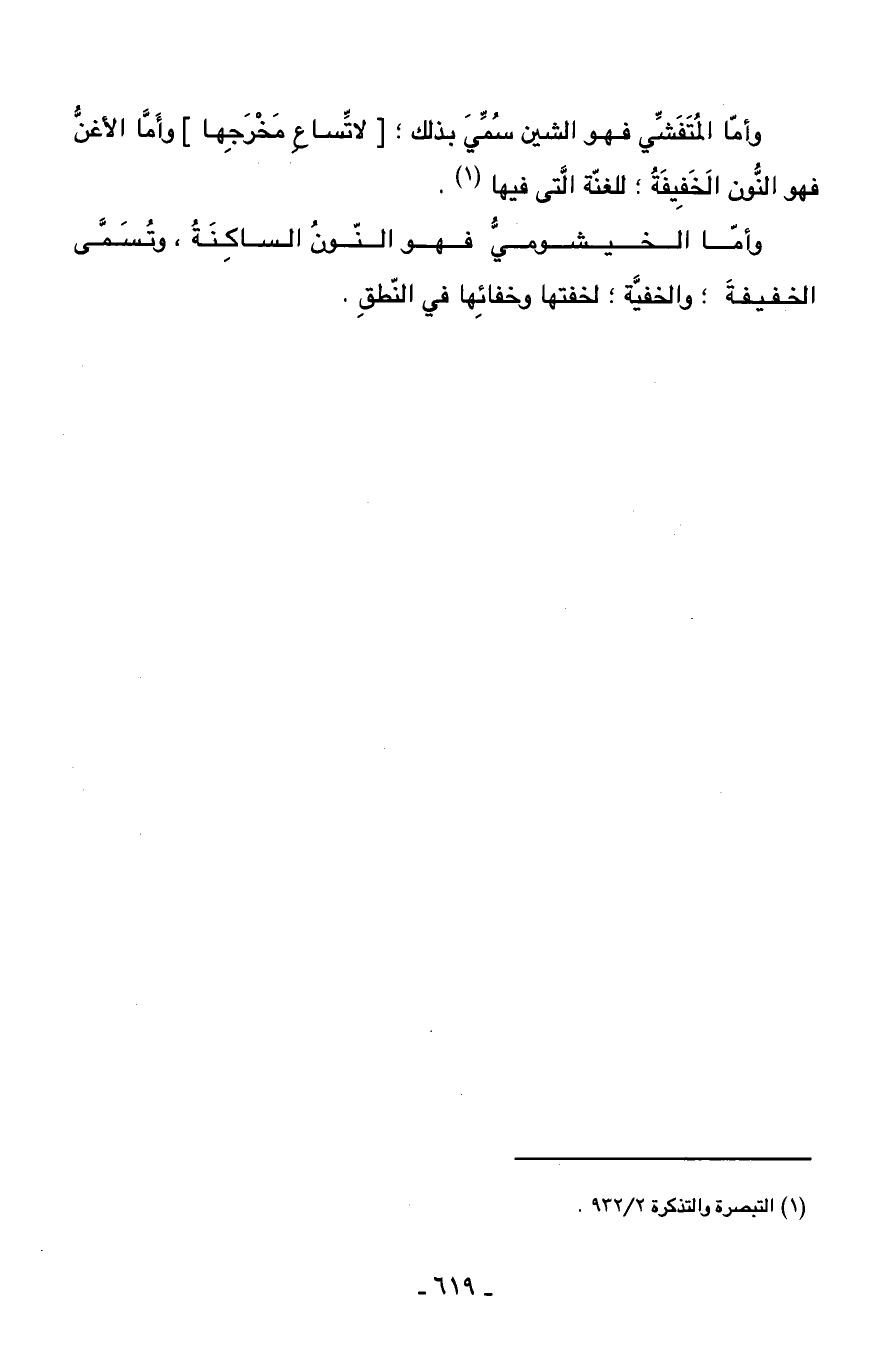 وأمّا المتفشّي فهو الشين سمّي بذلك؛ [لاتّساع مخرجها] وأمّا الأغنّ فهو النّون الخفيفة؛ للغنّة الّتى فيها (¬1).