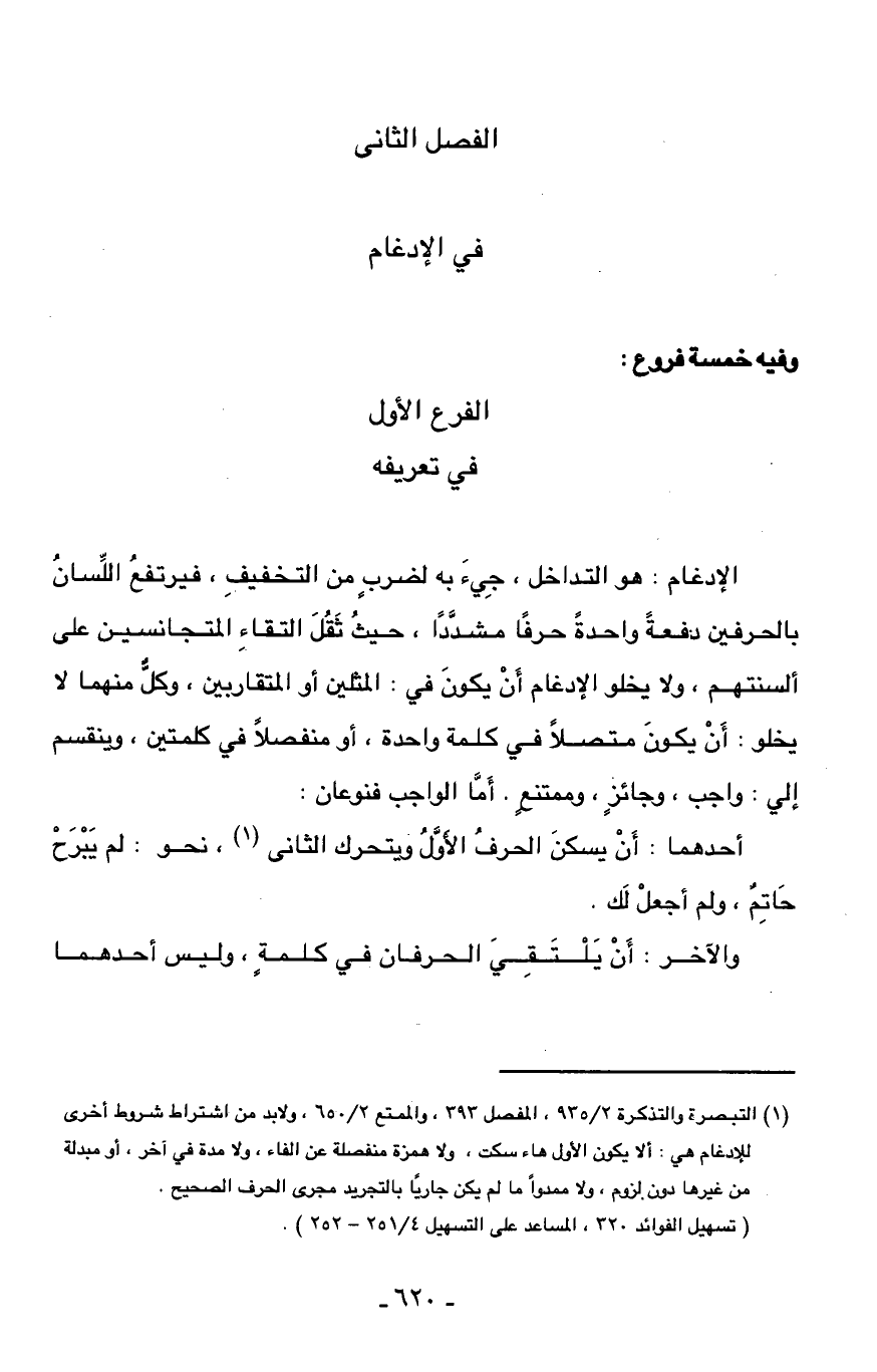 (¬1) التبصرة والتذكرة 2/ 935، المفصل 393، والممتع 2/ 650، ولا بد من اشتراط شروط أخرى للإدغام هي: ألا يكون الأول هاء سكت، ولا همزة منفصلة عن الفاء، ولا مدة في آخر، أو مبدلة من غيرها دون لزوم، ولا ممدوا ما لم يكن جاريا بالتجريد مجرى الحرف الصحيح.
