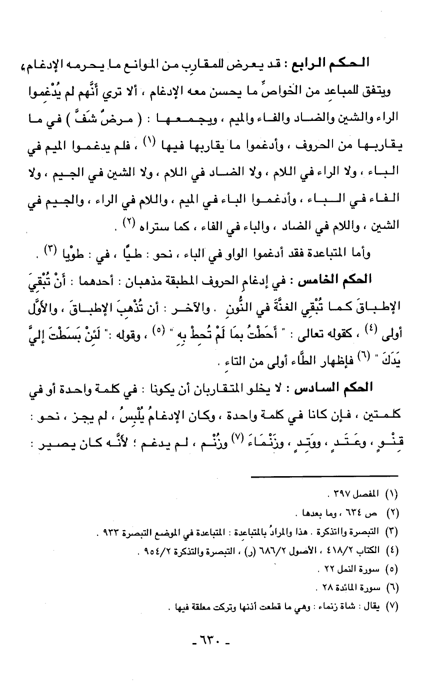 الحكم الرابع: قد يعرض للمقارب من الموانع ما يحرمه الإدغام، ويتفق للمباعد من الخواصّ ما يحسن معه الإدغام، ألا تري أنّهم لم يدغموا الراء والشين والضاد والفاء والميم، ويجمعها: (مرض شفّ) في ما يقاربها من الحروف، وأدغموا ما يقاربها فيها (¬1)، فلم يدغموا الميم في الباء، ولا الراء في اللام، ولا الضاد في اللام، ولا الشين في الجيم، ولا الفاء في الباء، وأدغموا الباء في الميم، واللام في الراء، والجيم في الشين، واللام في الضاد، والباء في الفاء، كما ستراه (¬2).
