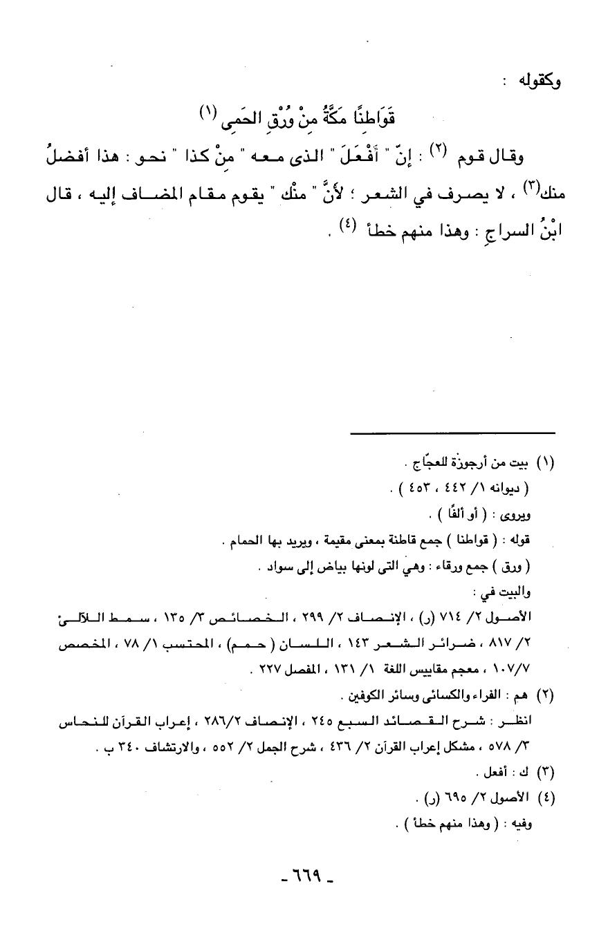 وقال قوم (¬2): إنّ" أفعل" الذى معه" من كذا" نحو: هذا أفضل منك (¬3)، لا يصرف في الشعر؛ لأنّ" منك" يقوم مقام المضاف إليه، قال ابن السراج: وهذا منهم خطأ (¬4).