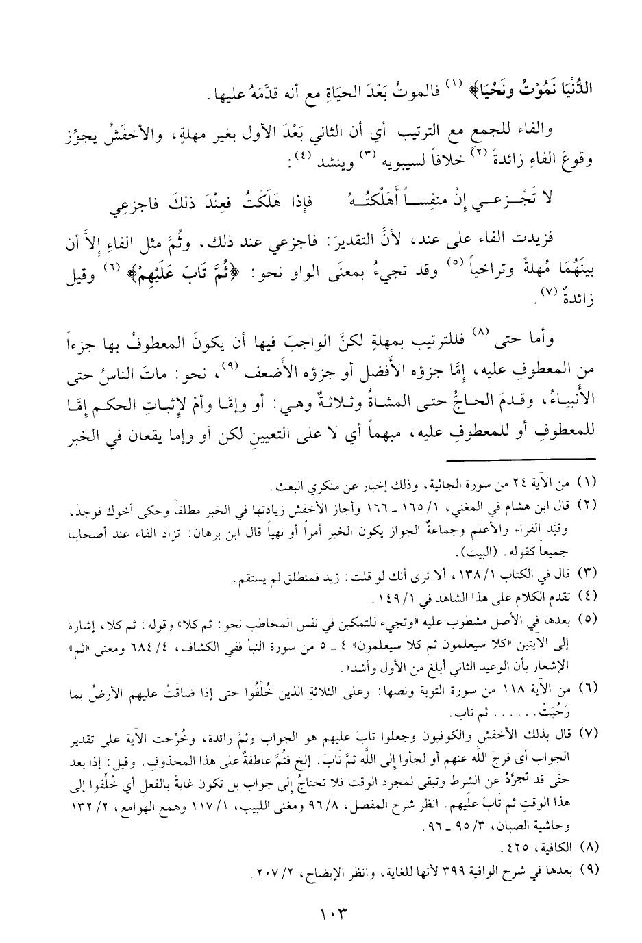 (¬5) بعدها في الأصل مشطوب عليه «وتجيء للتمكين في نفس المخاطب نحو: ثم كلا» وقوله: ثم كلا، إشارة إلى الآيتين «كلا سيعلمون ثم كلا سيعلمون» 4 - 5 من سورة النبأ ففي الكشاف، 4/ 684 ومعنى «ثم» الإشعار بأن الوعيد الثاني أبلغ من الأول وأشد».