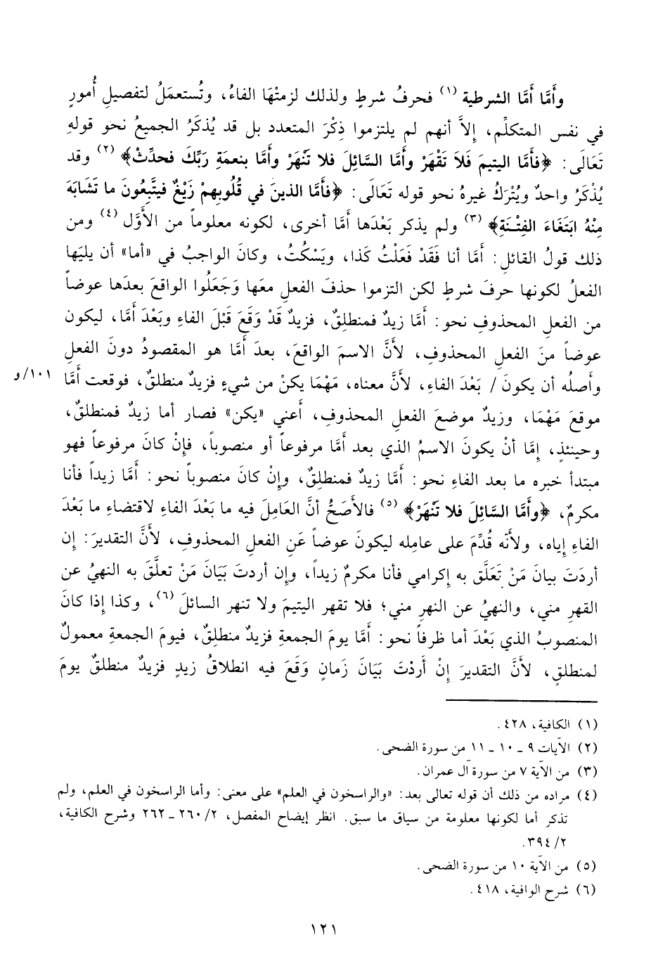 (¬4) مراده من ذلك أن قوله تعالى بعد: «والراسخون في العلم» على معنى: وأما الراسخون في العلم، ولم تذكر أما لكونها معلومة من سياق ما سبق. انظر إيضاح المفصل، 2/ 260 - 262 وشرح الكافية، 2/ 394.
