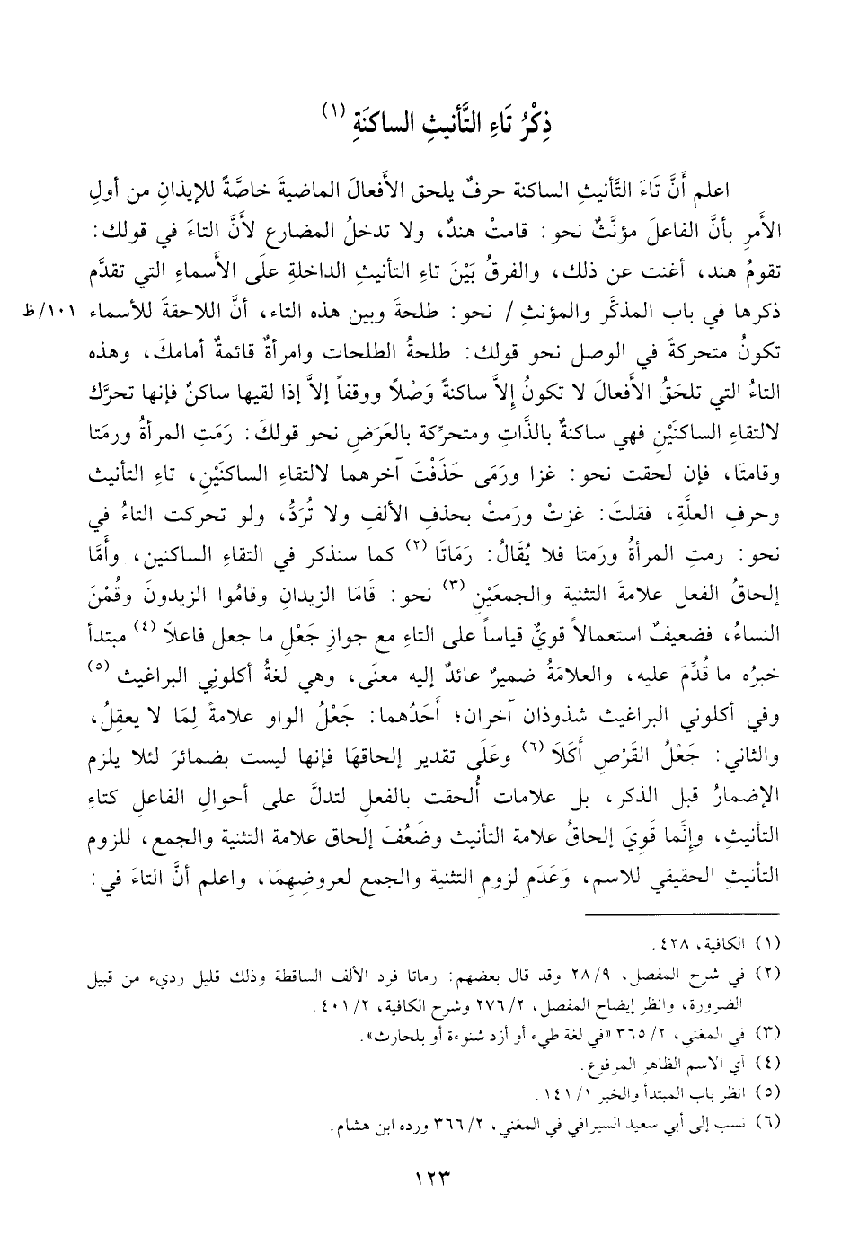 اعلم أنّ تاء التّأنيث الساكنة حرف يلحق الأفعال الماضية خاصّة للإيذان من أول الأمر بأنّ الفاعل مؤنّث نحو: قامت هند، ولا تدخل المضارع لأنّ التاء في قولك: