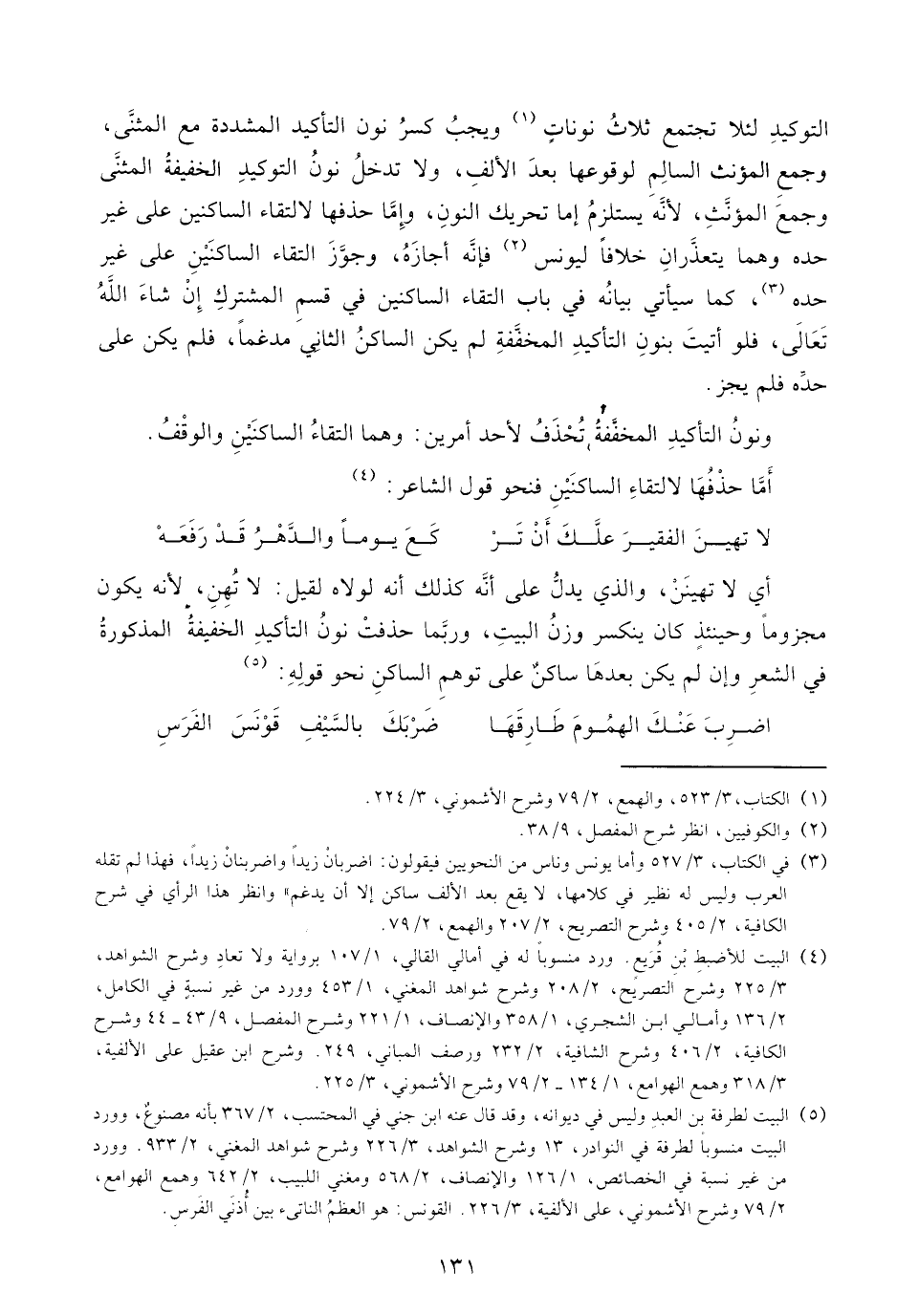 التوكيد لئلا تجتمع ثلاث نونات (¬1) ويجب كسر نون التأكيد المشددة مع المثنّى، وجمع المؤنث السالم لوقوعها بعد الألف، ولا تدخل نون التوكيد الخفيفة المثنّى وجمع المؤنّث، لأنّه يستلزم إما تحريك النون، وإمّا حذفها لالتقاء الساكنين على غير حده وهما يتعذّران خلافا ليونس (¬2) فإنّه أجازه، وجوّز التقاء الساكنين على غير حده (¬3)، كما سيأتي بيانه في باب التقاء الساكنين في قسم المشترك إن شاء الله تعالى، فلو أتيت بنون التأكيد المخفّفة لم يكن الساكن الثاني مدغما، فلم يكن على حدّه فلم يجز.