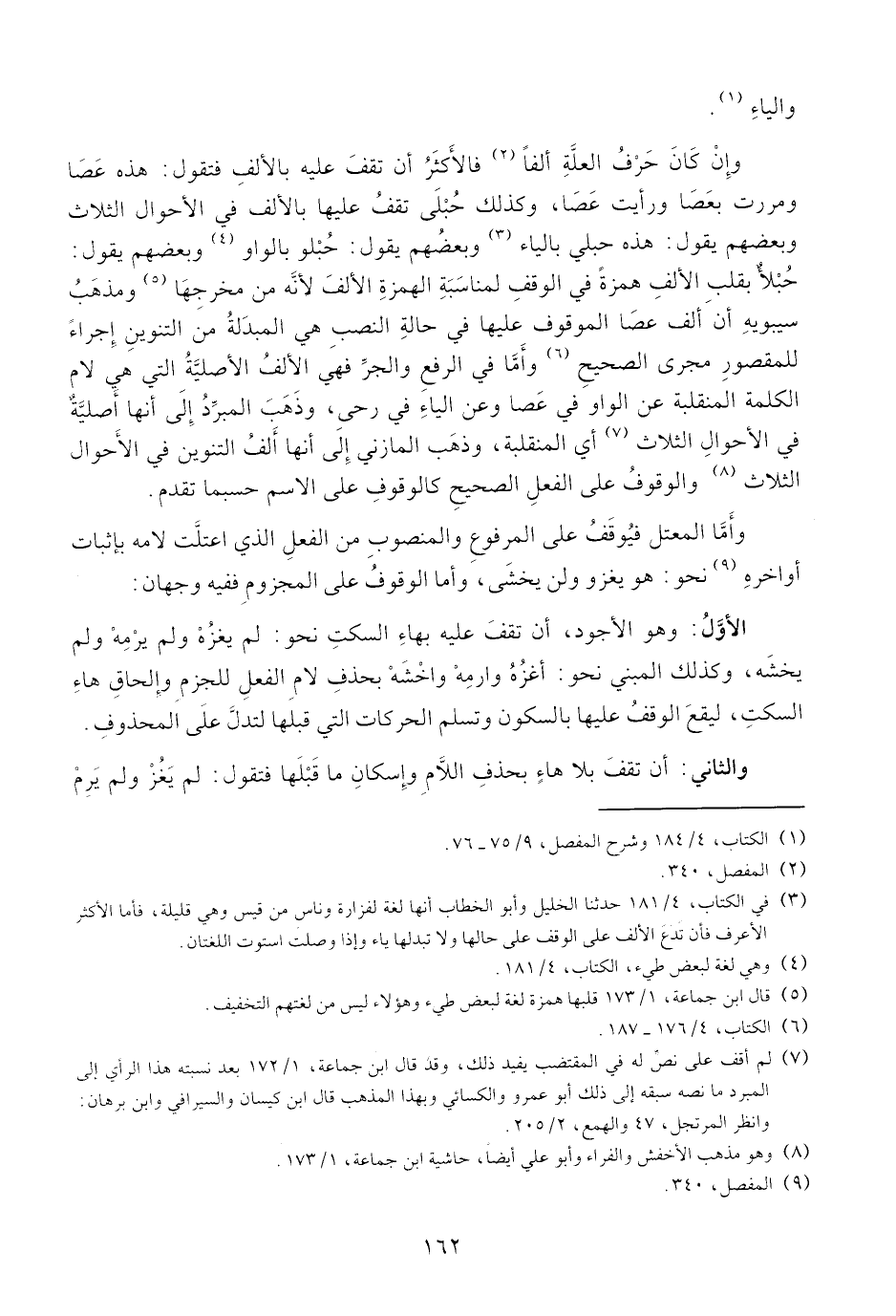 حبلأ بقلب الألف همزة في الوقف لمناسبة الهمزة الألف لأنّه من مخرجها (¬5) ومذهب سيبويه أن ألف عصا الموقوف عليها في حالة النصب هي المبدلة من التنوين إجراء للمقصور مجرى الصحيح (¬6) وأمّا في الرفع والجرّ فهي الألف الأصليّة التي هي لام الكلمة المنقلبة عن الواو في عصا وعن الياء في رحى، وذهب المبرّد إلى أنها أصليّة في الأحوال الثلاث (¬7) أي المنقلبة، وذهب المازني إلى أنها ألف التنوين في الأحوال الثلاث (¬8) والوقوف على الفعل الصحيح كالوقوف على الاسم حسبما تقدم.