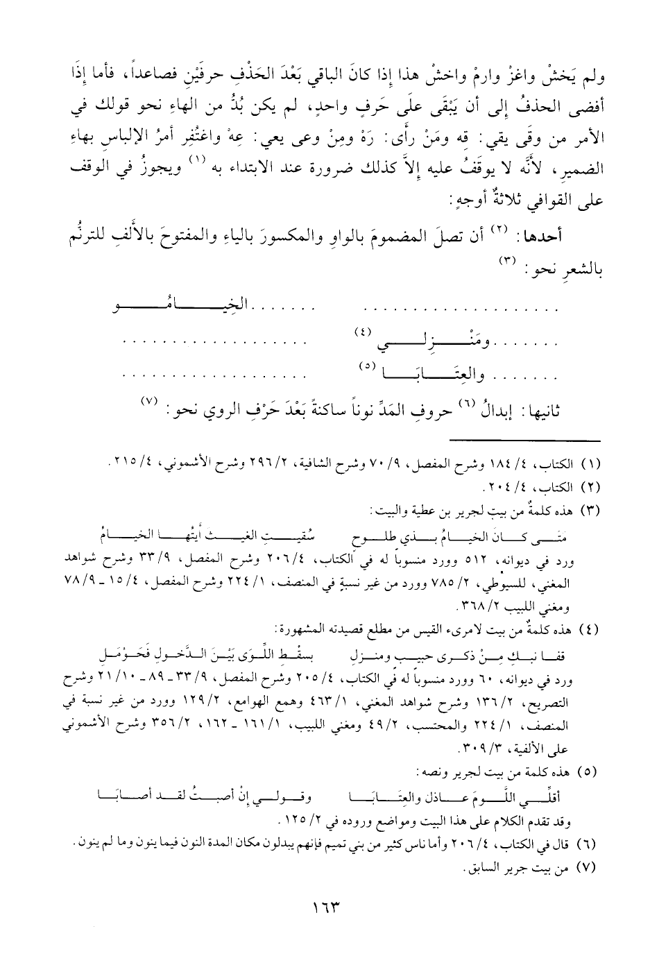 أحدها: (¬2) أن تصل المضموم بالواو والمكسور بالياء والمفتوح بالألف للترنّم بالشعر نحو: (¬3)