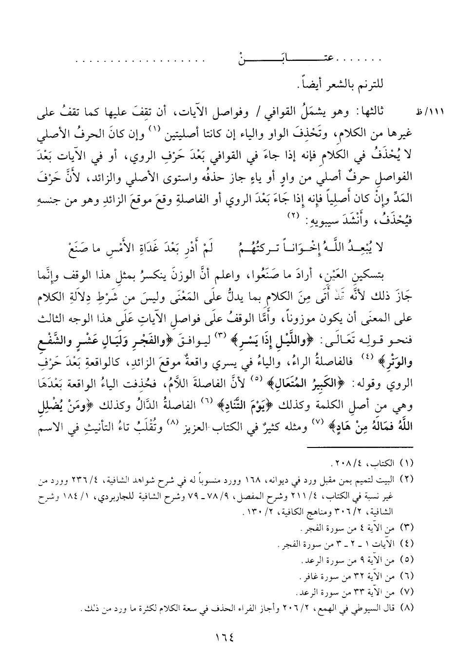 بتسكين العين، أراد ما صنعوا، واعلم أنّ الوزن ينكسر بمثل هذا الوقف وإنّما جاز ذلك لأنّه قد أتى من الكلام بما يدلّ على المعنى وليس من شرط دلالة الكلام على المعنى أن يكون موزونا، وأمّا الوقف على فواصل الآيات على هذا الوجه الثالث فنحو قوله تعالى: وَاللَّيْلِ إِذا يَسْرِ (¬3) ليوافق وَالْفَجْرِ وَلَيالٍ عَشْرٍ وَالشَّفْعِ وَالْوَتْرِ (¬4) فالفاصلة الراء، والياء في يسري واقعة موقع الزائد، كالواقعة بعد حرف الروي وقوله: الْكَبِيرُ الْمُتَعالِ (¬5) لأنّ الفاصلة اللّام، فحذفت الياء الواقعة بعدها وهي من أصل الكلمة وكذلك يَوْمَ التَّنادِ (¬6) الفاصلة الدّال وكذلك وَمَنْ يُضْلِلِ اللَّهُ فَما لَهُ