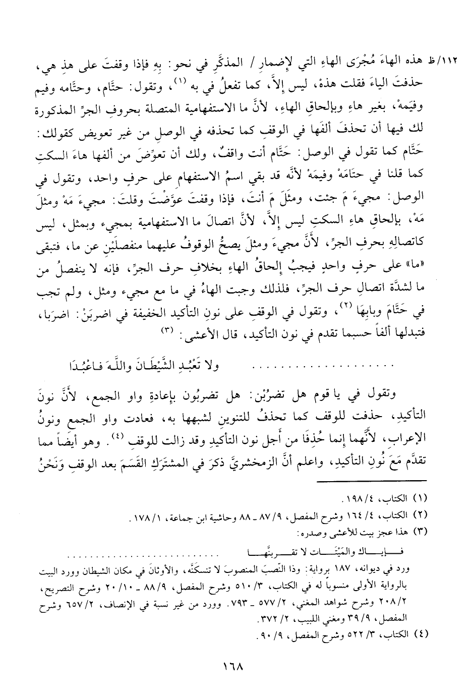وتقول في يا قوم هل تضربن: هل تضربون بإعادة واو الجمع، لأنّ نون التأكيد، حذفت للوقف كما تحذف للتنوين لشبهها به، فعادت واو الجمع ونون الإعراب، لأنّهما إنما حذفا من أجل نون التأكيد وقد زالت للوقف (¬4). وهو أيضا مما تقدّم مع نون التأكيد، واعلم أنّ الزمخشريّ ذكر في المشترك القسم بعد الوقف ونحن